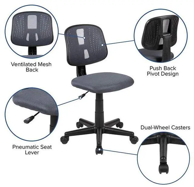 Tackle the workday with any challenge that comes your way on this snazzy desk chair. The cooling designer back features mesh material for exceptional airflow combined with gentle curved lumbar support. Our Fundamental Task Chair will make an impressive footprint in your office with its cutting edge structure. The innovate back pivots backward while leaning back for a comfortable resting period. Adjust your office desk chair with the pneumatic adjustment lever that controls the height of your seat. Effectively switch between tasks with 360 degrees of swivel motion. Providing exceptional value for today's modern office, our Fundamental Seating will afford you the opportunity to purchase seating for students and small businesses.