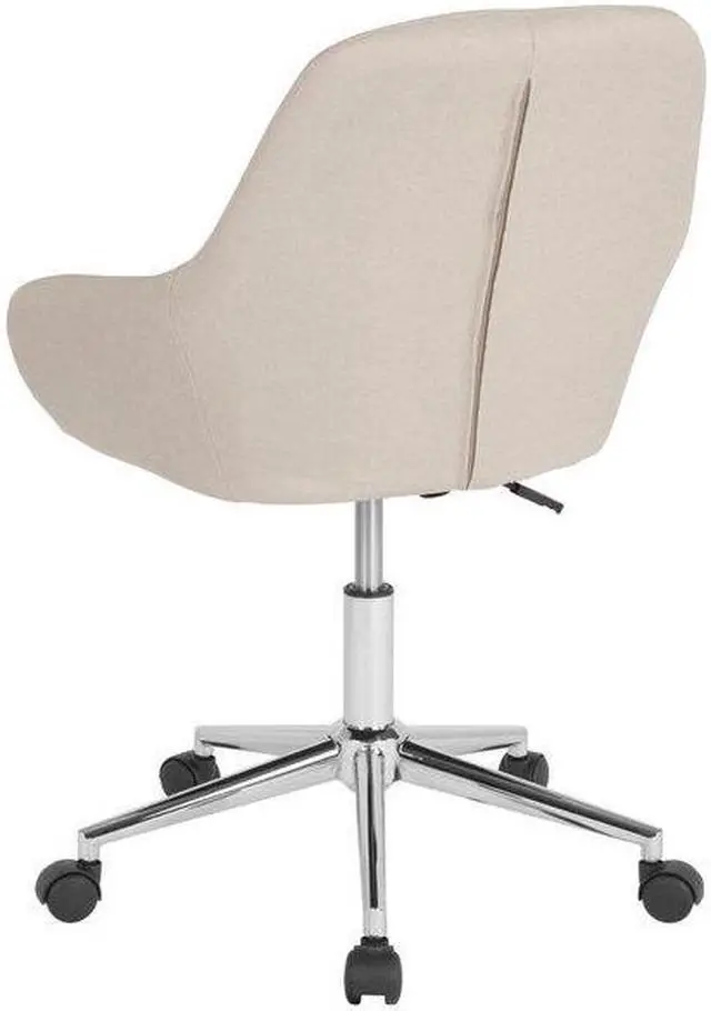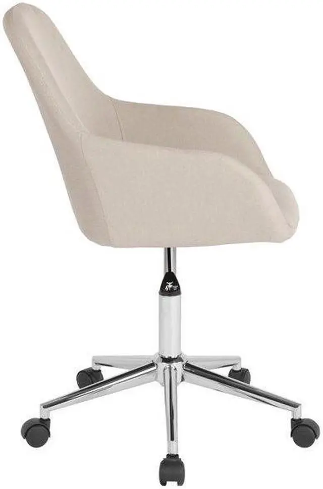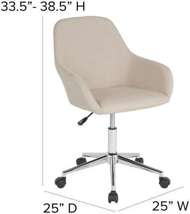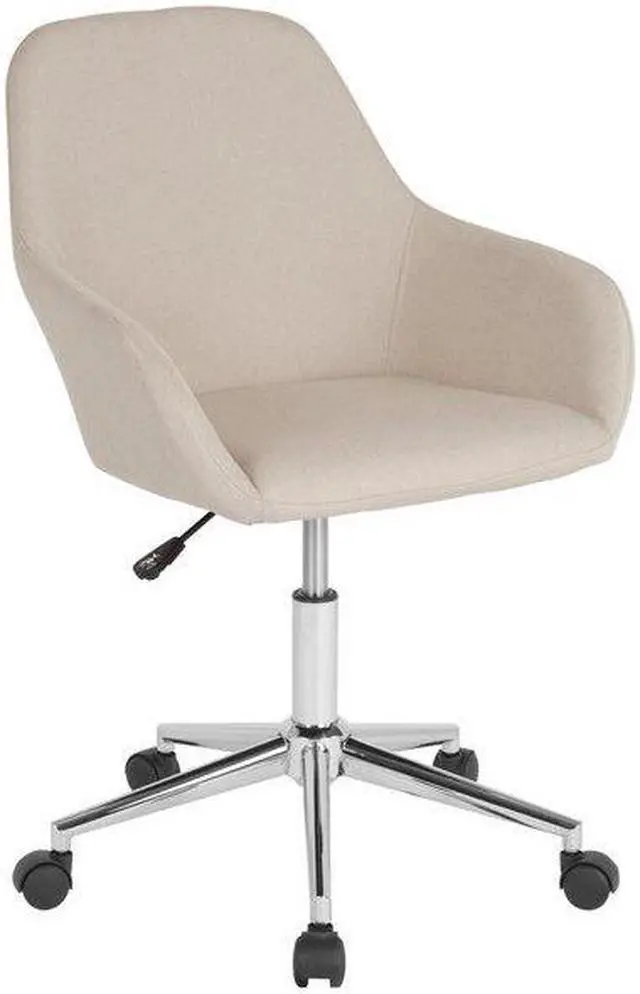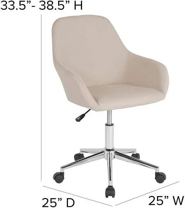 Reminiscent of an earlier time, the classic style of this bucket type task chair will always be popular. This chair boasts stylish integrated flared arms and beige fabric upholstery. This chair is ideal for those who spend the bulk of their day seated because of the mid back support that it offers to the mid to upper back region. Chair rotates 360 degrees to provide easy access to all of your work surfaces. A pneumatic seat height adjustment lever lets you easily position the chair at a height that is most comfortable for you. The chrome base provides a modern finish to this sophisticated versatile home or office chair. This retro-modern office chair is a great choice to complete the look in any office, reception, conference room or home office.