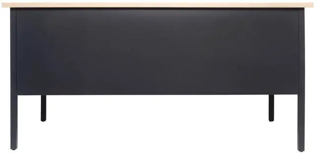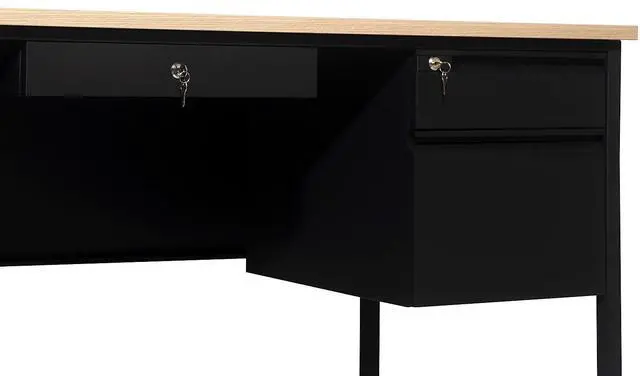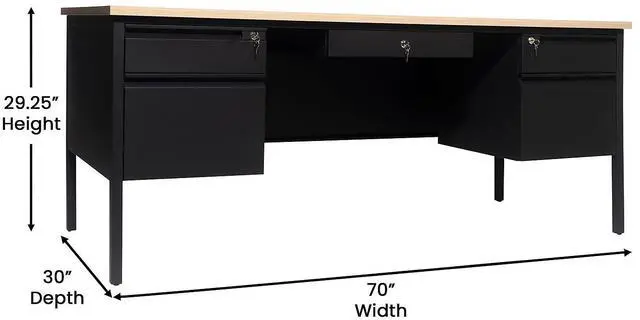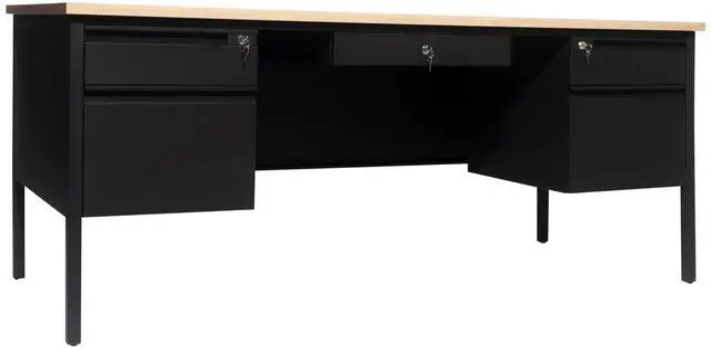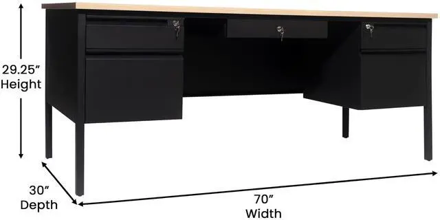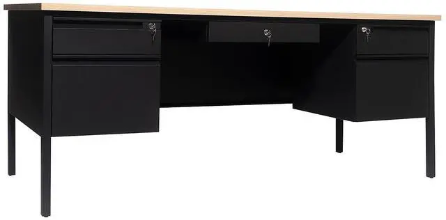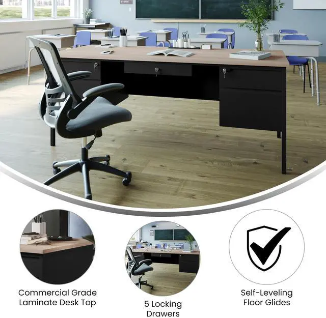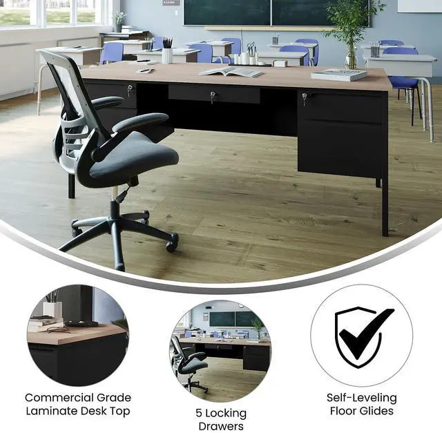 Give teachers and office workers alike a dedicated space for their tasks that is both functional and professional with this commercial grade double pedestal desk. Featuring a 1" thick long-lasting laminate top, steel frame, and 5 locking drawers with ball bearing drawer slides, this multipurpose desk will stand up to the rigors of daily use. The premium materials allow this metal and wood desk to hold up to 300 lbs. static weight while the self-leveling floor glides ensure a level work surface. Assembly takes 30 minutes or less and a damp cloth is all that is needed to maintain the appearance of this must-have work space.