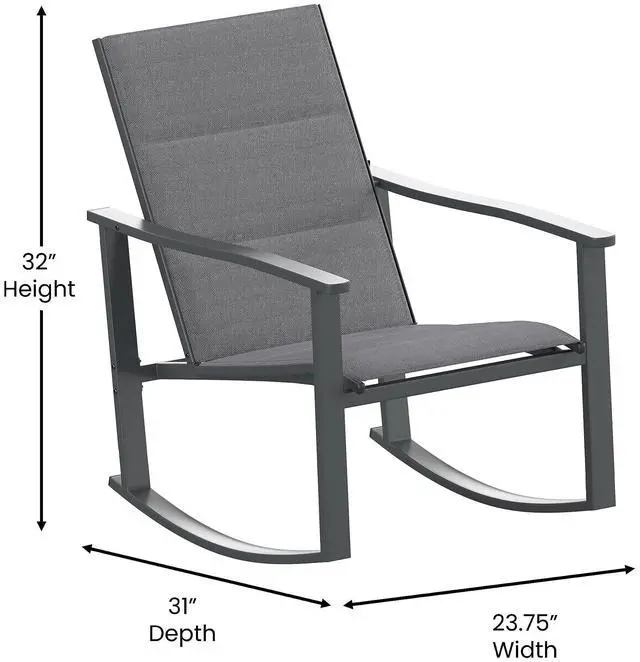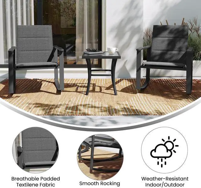 Spend some quality leisure time outdoors with this 3 piece all-weather rocking chair and table patio set. Boasting quick dry textilene flex comfort material, these rockers are perfect for poolside, patios and decks. Integrated armrests and smooth motion curved runners allow for total relaxation. The included glass topped side table not only looks great but also provides much needed horizontal real estate for drinks, cell phones, or snack plates. Powder coated steel frames are weather and rust resistant and allow the chairs to hold up to 300 lbs. static weight and the table to hold up to 50 lbs. static weight. Fixed floor glides on the table will prevent damage to your indoor flooring surfaces. Your new lounge set assembles in 30 minutes or less and wipes clean with a damp cloth ideal for busy households. This chair and table set is available in multiple colors to suit your taste.