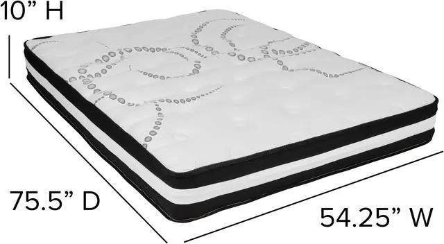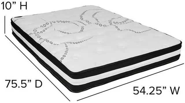 Constructed from 19 gauge solid steel with reinforced metal screw construction this frame will support up to 650 pounds. Solid steel slats hold the included 10" foam and pocket spring mattress without sagging and does not require a box spring. The lack of a headboard or footboard streamlines any sleep space and will lend vertical real estate to smaller bedrooms. Last, but definitely not least, this complete bed set bundle gives you the mattress of your dreams. This medium-firm mattress features individually wrapped pocket spring coils for exceptional support to alleviate pressure points and reduced motion transfer to help you stay asleep.