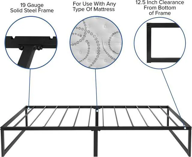 Constructed from 19 gauge solid steel with reinforced metal screw construction this frame will support up to 650 pounds. Solid steel slats hold the included 12" foam and pocket spring mattress without sagging and does not require a box spring. The lack of a headboard or footboard streamlines any sleep space and will lend vertical real estate to smaller bedrooms. Last, but definitely not least, this complete bed set bundle gives you the mattress of your dreams. This medium-firm mattress features individually wrapped pocket spring coils for exceptional support to alleviate pressure points and reduced motion transfer to help you stay asleep.