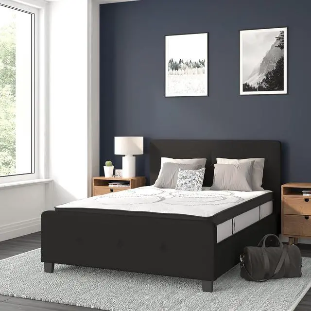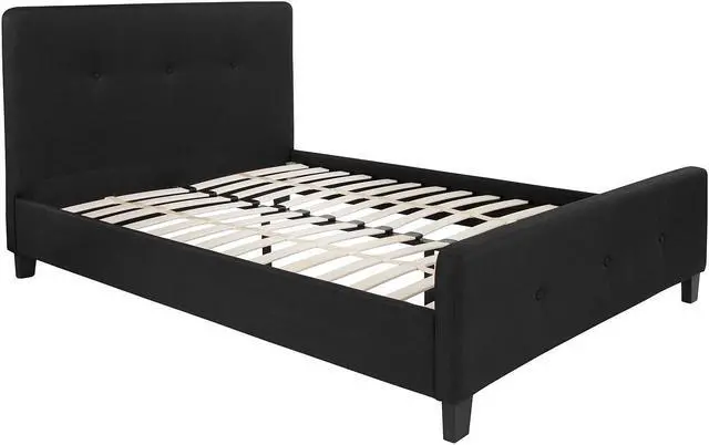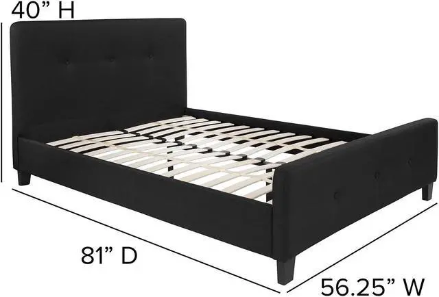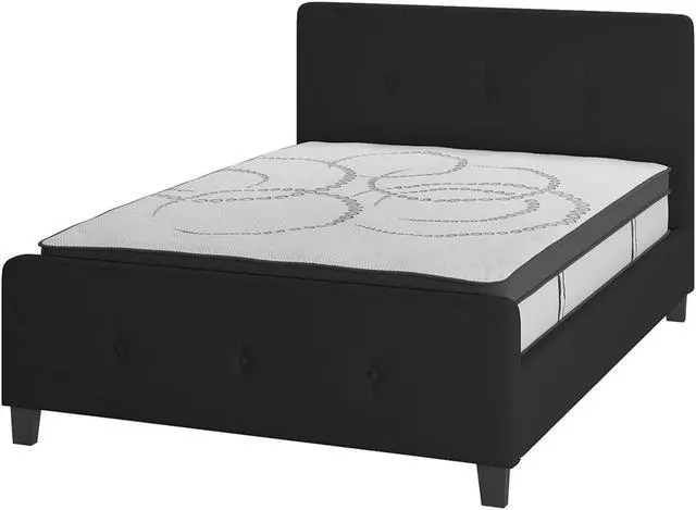 This casual looking platform bed has button tufting that adds a nice touch to display a unique look in your bedroom. If you're on the market for a bed that provides an open concept feel, this bed provides that in a stylish package. The headboard won't take up too much wall space so you can add decorative art above its frame. With a low set footboard it makes a presence that won't overrun your space. The matching button tufted headboard and footboard unify the design. The frame features a center support leg and 28 wooden slats that are designed to support the mattress without the use of a box spring. The 10" pocket spring mattress provides superior motion isolation and supports the contours of your body. The interior make-up consists of pocket spring coils and CertiPUR-US Certified foam. The mattress instantly starts expanding once you cut the plastic and will return to its original shape in 48 to 72 hours. Update your bedroom or guest bedroom furniture with this easy-going bed set. Full Size Platform Bed with Mattress Included. Black Fabric Tufted Upholstered Bed. Panel Headboard Size: 56.25"W x 2.5"D x 36"H. 28 Wood Support Slats with Center Support Metal Leg. Slat to Floor Height: 11.25"; Underbed Height: 4". 10" Pocket Spring Mattress Size: 54.25"W x 75.5"D x 10"H. CertiPUR-US Certified Foam Cushioning with Tight Knit Top. Soft Comfort for all sleep positions. Individually wrapped 6.5 gauge springs reduce motion transfer and minimize pressure points. Arrives Boxed for your convenience, please allow 48 to 72 hours for mattress to fully expand.