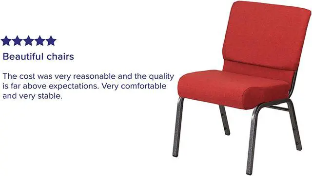 This beautiful, supremely comfortable padded chair will ensure your guests have an enjoyable experience whether you're hosting an all-day seminar, serving a 10 course meal or delivering your most inspirational sermon. Unlike pew seating, these chairs give you the capability to create different seating configurations as often as you wish making them an ideal seating solution for any venue. The upholstered stack chair with 4" thick seat are generously padded and covered in durable fabric upholstery. The spacious, 21" wide seat has a waterfall edge that provides an extra level of comfort by reducing pressure on your attendees' legs. A convenient book pouch on the back of the chair keeps seminar materials, bibles or hymn books readily available. Its sturdy 16 gauge steel, copper vein frame, with gracefully angled legs, has been tested to hold up to 800 pounds and plastic rocker glides protect your floor by sliding smoothly when you need to move the chair. This commercial side chair is stackable for easy storage making it an excellent choice for event venues, hotel lobbies, banquet halls, conference facilities and worship centers.Product Dimension-21.25"W x 25"D x 33"H