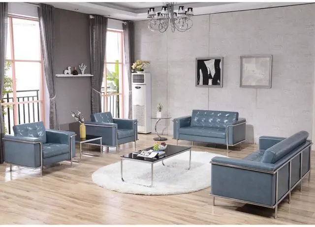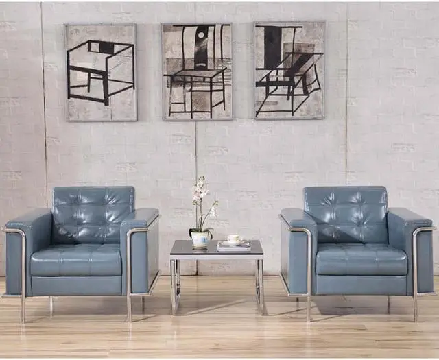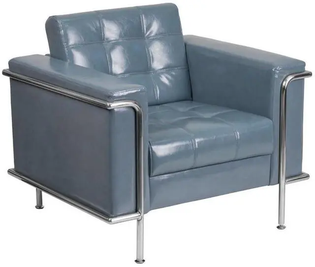 Your office reception space speaks to who your are as a company and this gray LeatherSoft upholstered chair with encasing frame makes quite a statement. This trendsetting piece features a straight arm design and foam filled, tufted, fixed back and seat cushion for exceptional comfort. LeatherSoft is leather and polyurethane for added softness and durability. The integrated stainless steel frame and exposed accent bar not only add style, they are rust resistant and will keep up with the rigors of commercial use. Make a great impression on your clients, customers, and guests with this innovative contemporary chair.