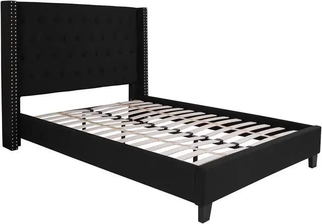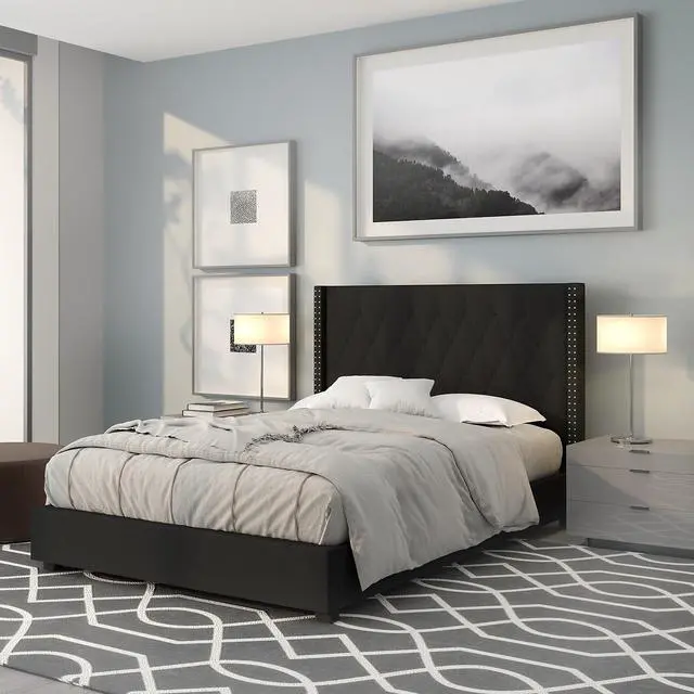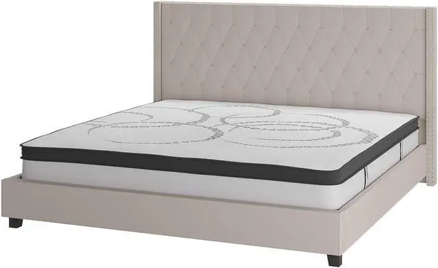 Look no further, you've found the bed of your dreams at a price no one will believe. This gorgeous platform bed will keep your bedroom looking fresh for years. This beauty is adorned by nailhead trimming on the protruding sides and has a button tufted panel headboard. The headboard has a decent amount of height to prop yourself up against it. No footboard means you have easy access to make up your bed. The low base frame provides you with an open concept feel. Settle in for a peaceful night of resting atop the pocket spring mattress supported by 45 wooden slats that are designed to support the mattress without the use of a box spring. The 10" pocket spring mattress provides superior motion isolation and supports the contours of your body. The interior make-up consists of pocket spring coils and CertiPUR-US Certified foam. The mattress instantly starts expanding once you cut the plastic and will return to its original shape in 48 to 72 hours. You deserve a job well done for selecting such a breathtaking bed that will give your space the uplift that you've been yearning for. King Size Platform Bed with Mattress Included. Beige Fabric Tufted Upholstered Bed with Silver Nailhead Trim. Panel Headboard Size: 84"W x 4"D x 31.5"H. 45 Wood Support Slats with Center Support Metal Leg. Slat to Floor Height: 11.25"; Underbed Height: 4". 10" Pocket Spring Mattress Size: 75.5"W x 81"D x 10"H. CertiPUR-US Certified Foam Cushioning with Tight Knit Top. Soft Comfort for all sleep positions. Individually wrapped 6.5 gauge springs reduce motion transfer and minimize pressure points. Arrives Boxed for your convenience, please allow 48 to 72 hours for mattress to fully expand.