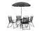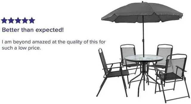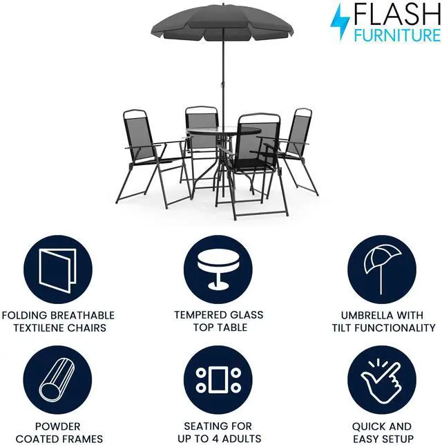 Round Patio Table Set, Chair Seat Material Fabric, Includes Umbrella Hole Yes, Number of Chairs 4, Table Diameter 31 1/4 in, Table Height 28 in, Table Weight 10 lb, Tabletop Color Clear, Tabletop Material Glass, Chair Seat Color Black, Chair Weight Capacity 286 lb, Includes Umbrella Umbrella Included, Table Frame Material Metal, Table Length Not Applicable, Table Shape Round, Assembly Unassembled, Chair Depth 25 in, Chair Height 35 1/4 in, Chair Width 21 1/4 in, Chair Finish Powder Coated