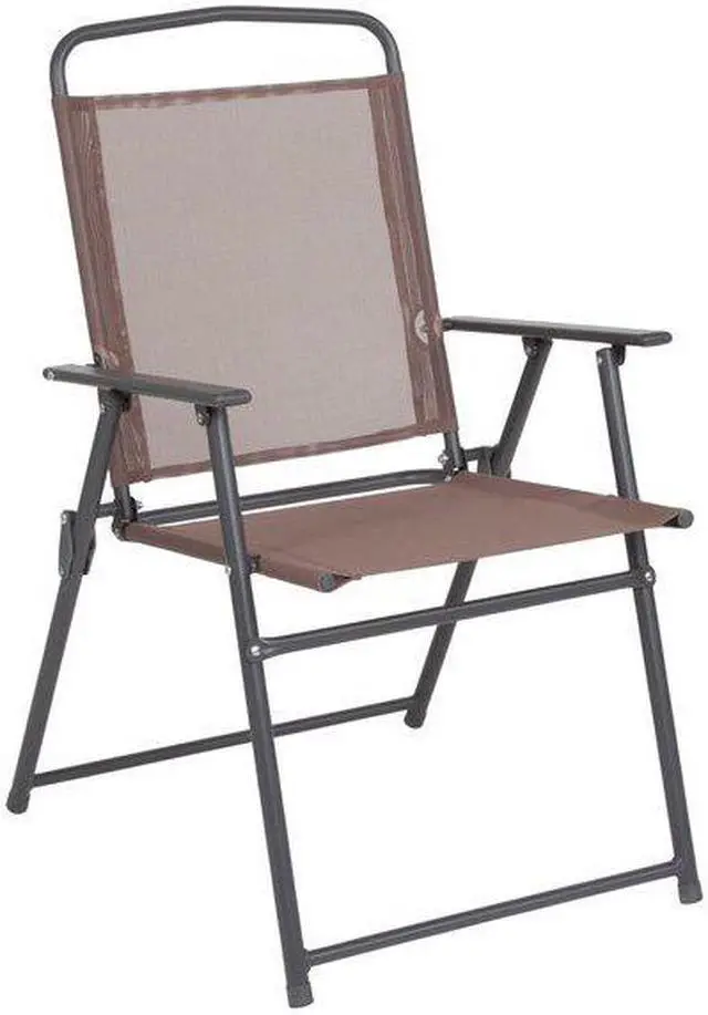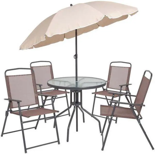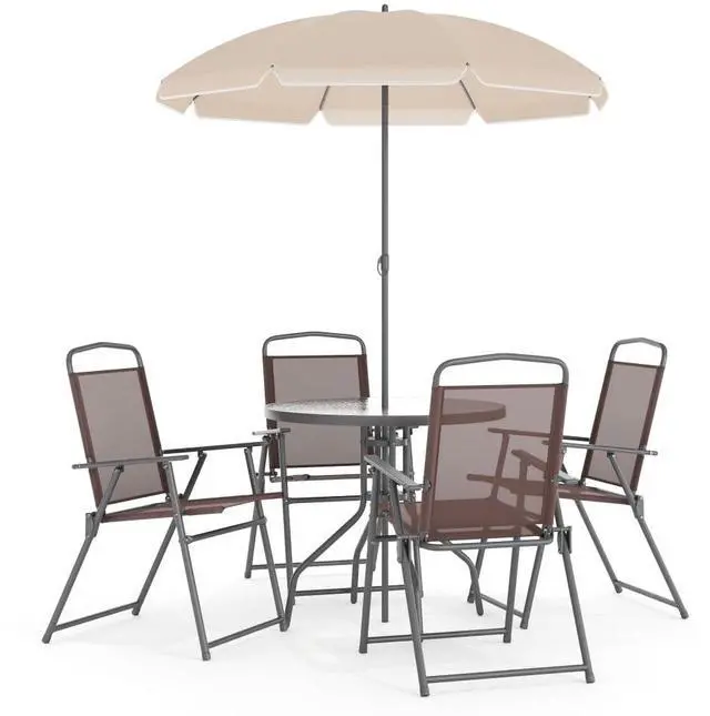 Nantucket 6 Piece Brown Patio Garden Set with Table, Tan Umbrella and 4 Folding Chairs