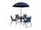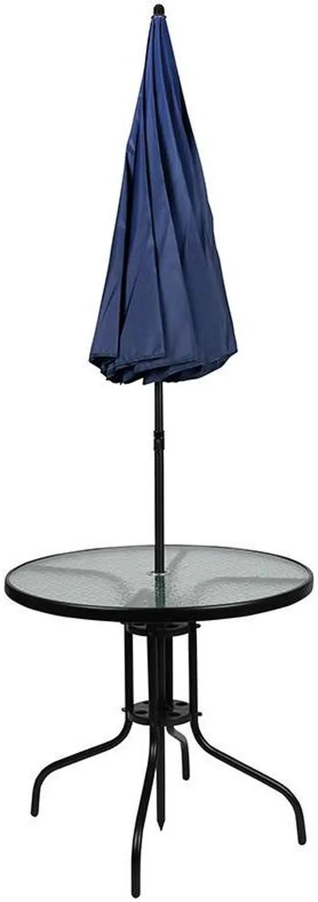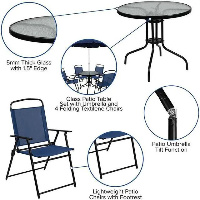 The attractive rippled tempered glass sits atop a 4-legged metal framed base. The included umbrella will shade you on those sunny days and has a tilt function that is activated by pushing the plastic ring on the pole. For longevity, care should be taken to protect from long periods of wet weather. Clean with a water based cleaning solution to keep in pristine condition. Take the stresses of the day away with this all-in-one patio table set for dining, entertaining, and relaxing.