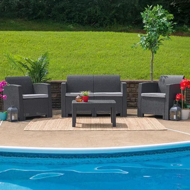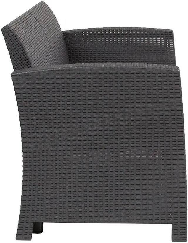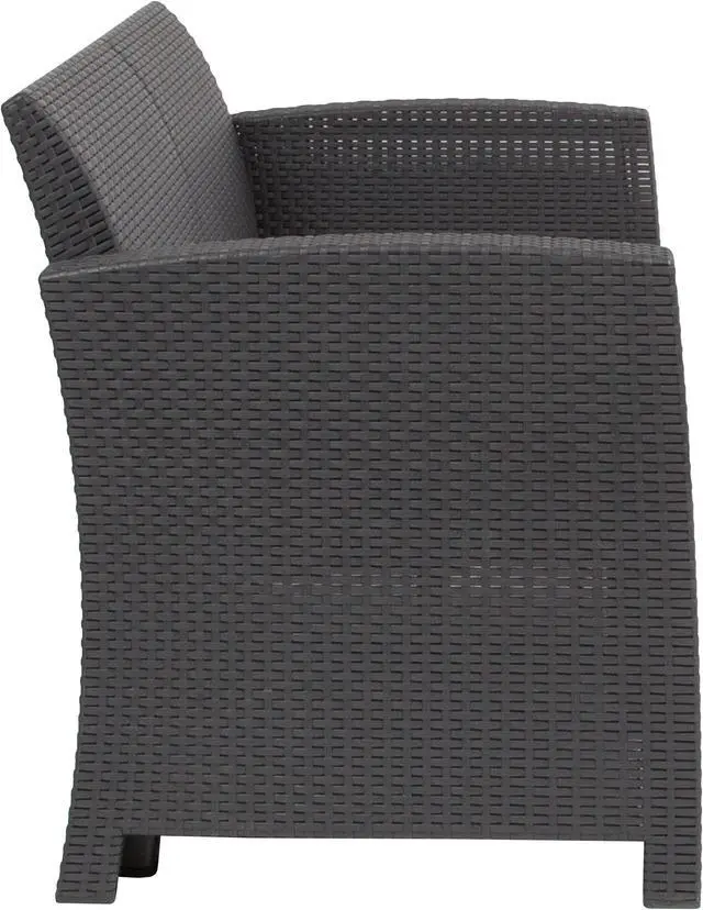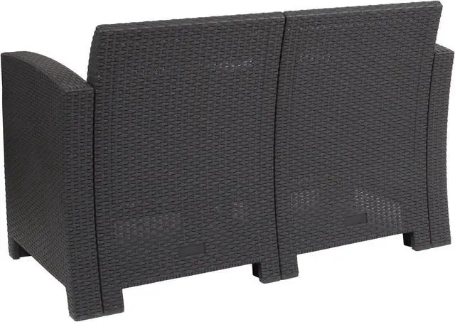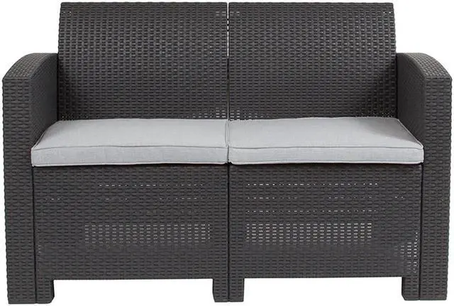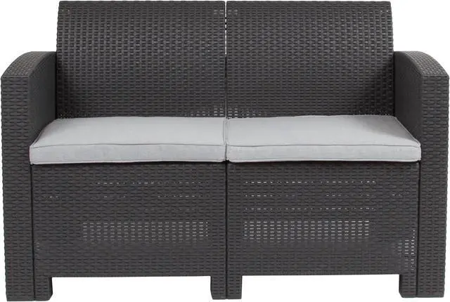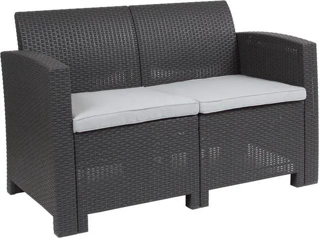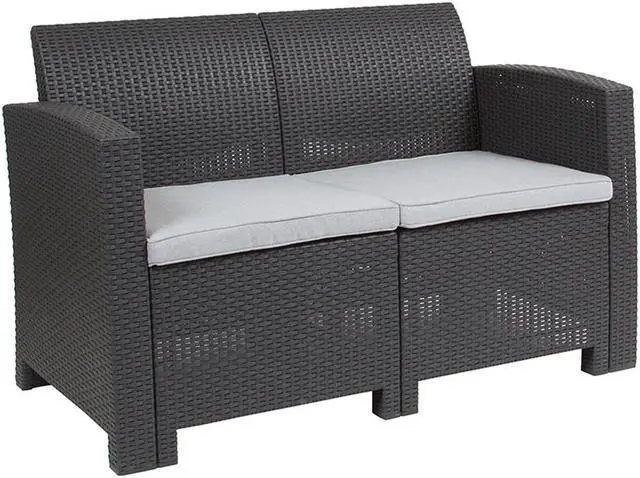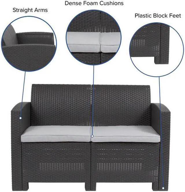 Create an amazing outdoor space with this comfortable and stylish dark gray patio loveseat. The durable resin frame offers a stylish appearance which replicates rattan. Deep seating enhances the comfort level. Light gray all-weather cushions will hold up all season long. Clean spills with a water-based cleaner or the cushions are zipper removable for washing purposes. Curl up with your latest read, or just relax and enjoy the outdoors with family and friends and create lasting memories!