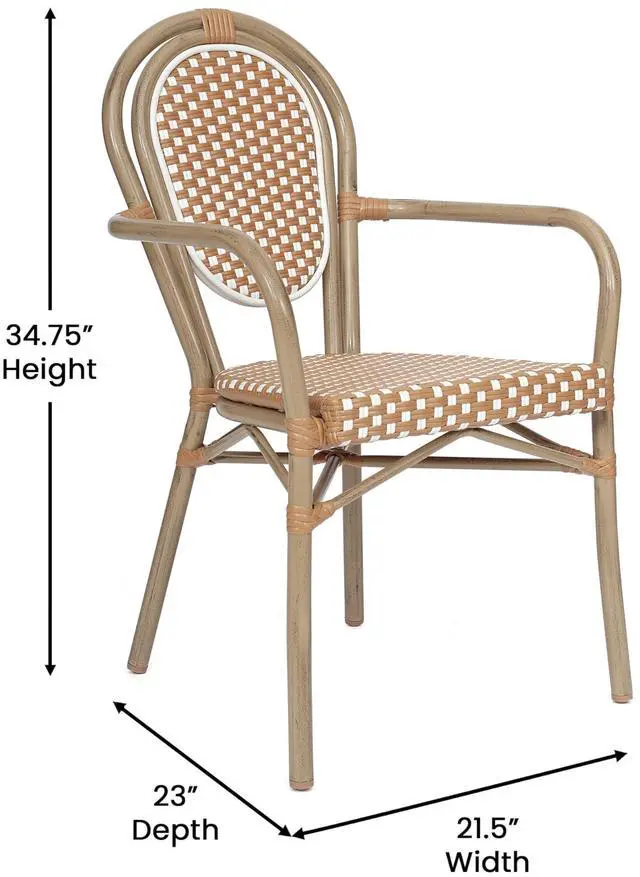 Flash Furniture Lourdes Indoor/Outdoor Commercial Thonet Bistro Stack Chair - Curved Arms - NAT/White PE Rattan Back and Seat - Lt NAT Bamboo Print Metal Frame