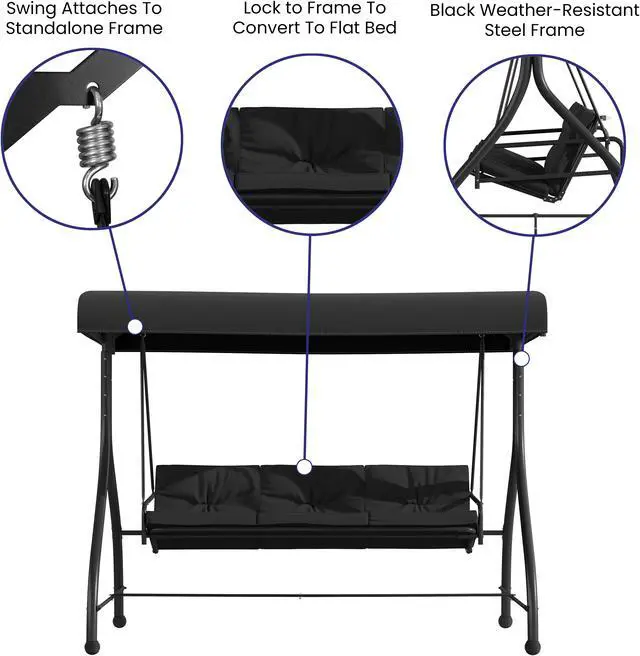 Take some time to unwind and let the rhythmic motion of this covered patio swing lull you into relaxation. An adjustable canopy allows you to decide how much sunlight you receive while the back and seat cushions keep you comfortable. The quality steel frame is capable of holding up to 800 pounds and will comfortably seat up to 3 adults. Recline the back and attach it to the frame to make a flat bed for an afternoon nap. The rich fabric of the canopy and cushions pairs nicely with the black frame finish to create a sophisticated look for your outdoor space. Fixed plastic floor glides will allow the set to move easily. The polyester material is easily cleaned with a water based cleaner. Reduce stress and make the most of your evenings and weekends with this patio porch swing that is sure to become your go-to seat.