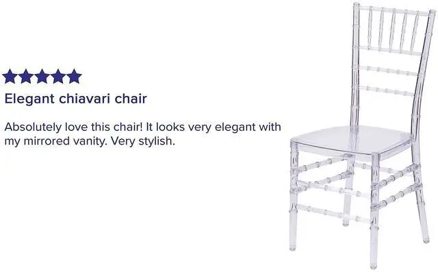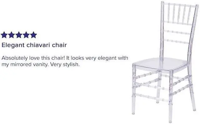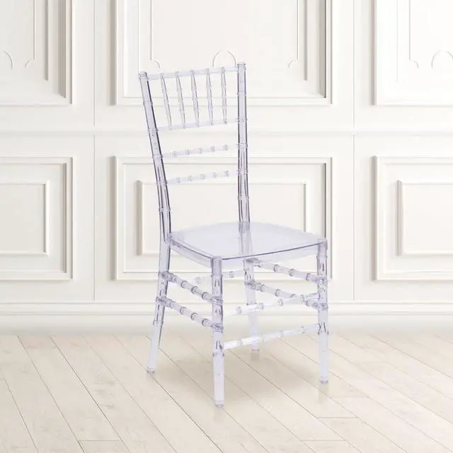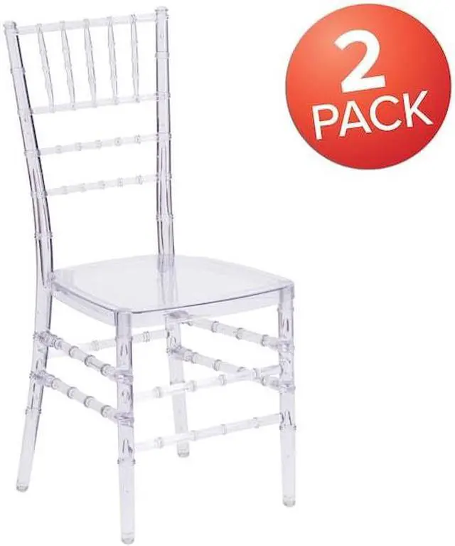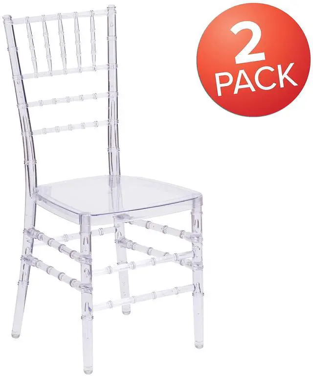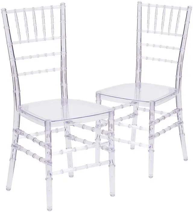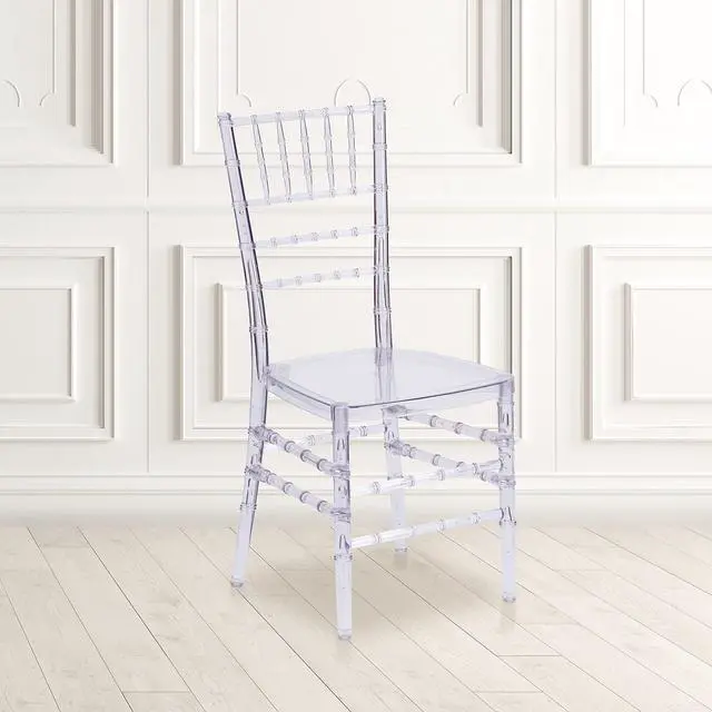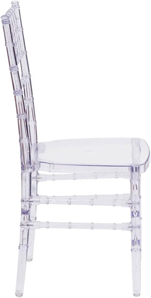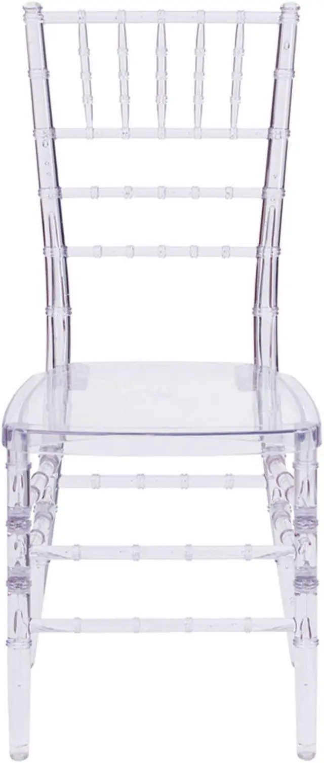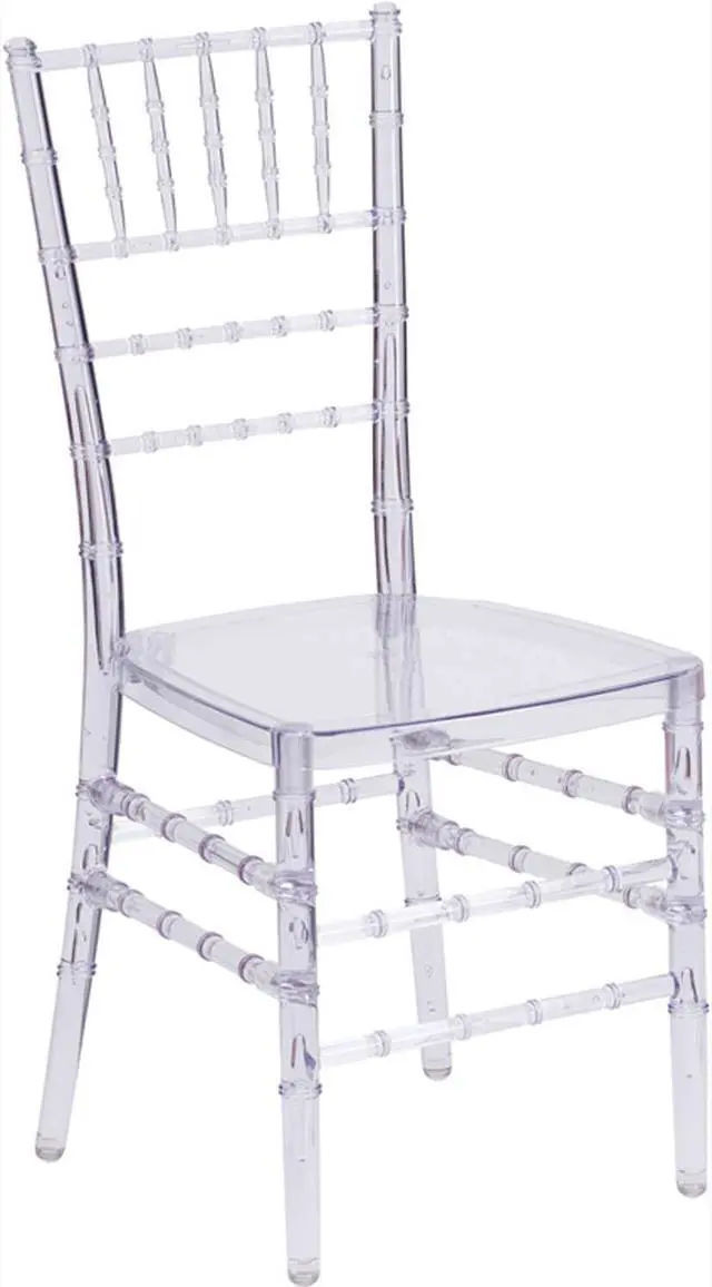 The Crystal Ice Chiavari Chair is ideal for weddings, banquets and special events from casual to the most elegant. Constructed of ultra-strong polycarbonate, it is shock, scratch and water resistant, extremely strong and wobble free. These beautiful chairs ship fully assembled, can be stacked 10 high for storage. With its durable, lightweight construction and elegant styling, this Chiavari chair will be the prime seating choice for all of your special events. You can use the chair outdoors, which makes it a great choice for summertime gatherings and special events. Designed for Indoor or Outdoor Use. Designed for Commercial Use. 2 Year Limited Warranty on Frame.