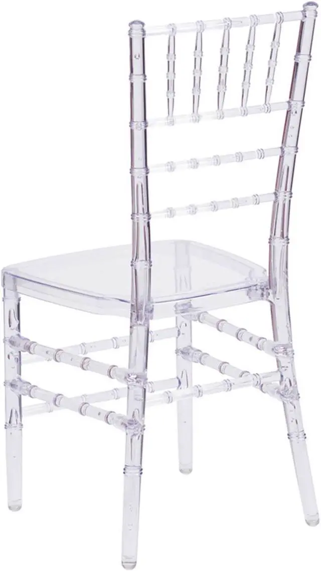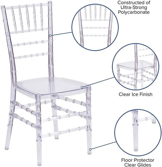 Single Unit Weight: 12 lbs. Fixed Dimensions: 20"L x 15.75"W x 36.25"H. Fixed Back Width: 13 Inches. Fixed Back Height From Seat: 18.75 InchesFixed Seat Dimensions: 16"L x 15.5"W x 17.5"H. Stack Quantity: 10 Count. Weight Capacity: 1100 lbs. Color: Clear. Material: Plastic. Chiavari SeatingBack Material: Plastic. Back Color: Clear. Frame Color: Clear. Frame Material: Plastic. Seat Color: Clear. Seat Material: Plastic. Clear Ice FinishLightweight Design. Constructed of Ultra-Strong Polycarbonate. High Impact Strength. Low Temperature Resistant. Fireproof and WaterproofStyle: Traditional. Suitable for Outdoor Use. Rated For Commercial Use. Wobble Free Construction. Fully Assembled. Floor Protector Clear Glides