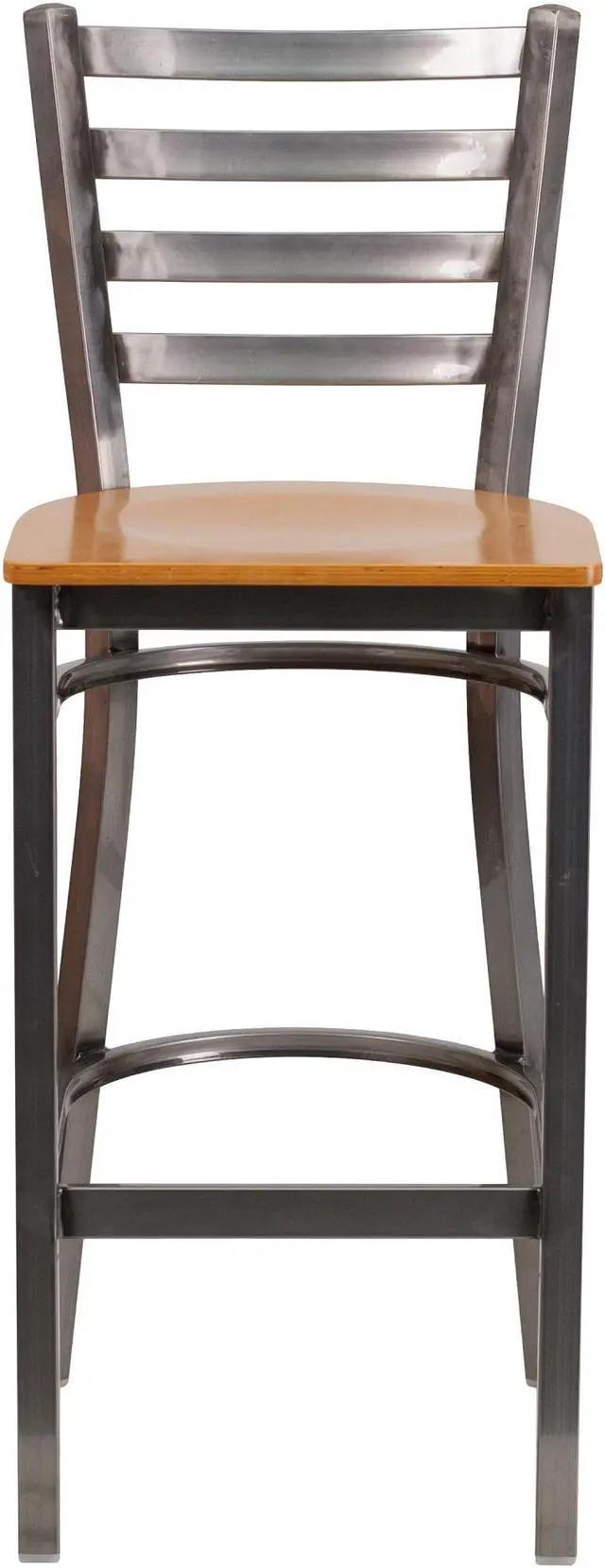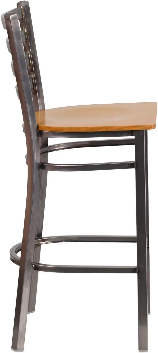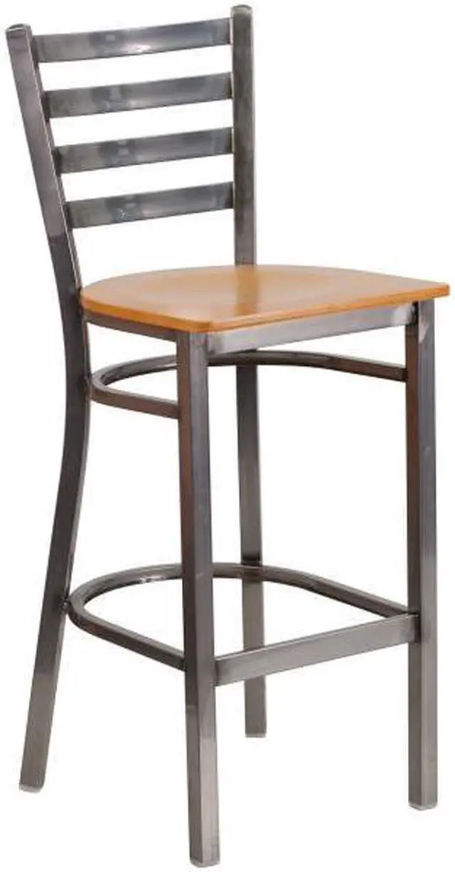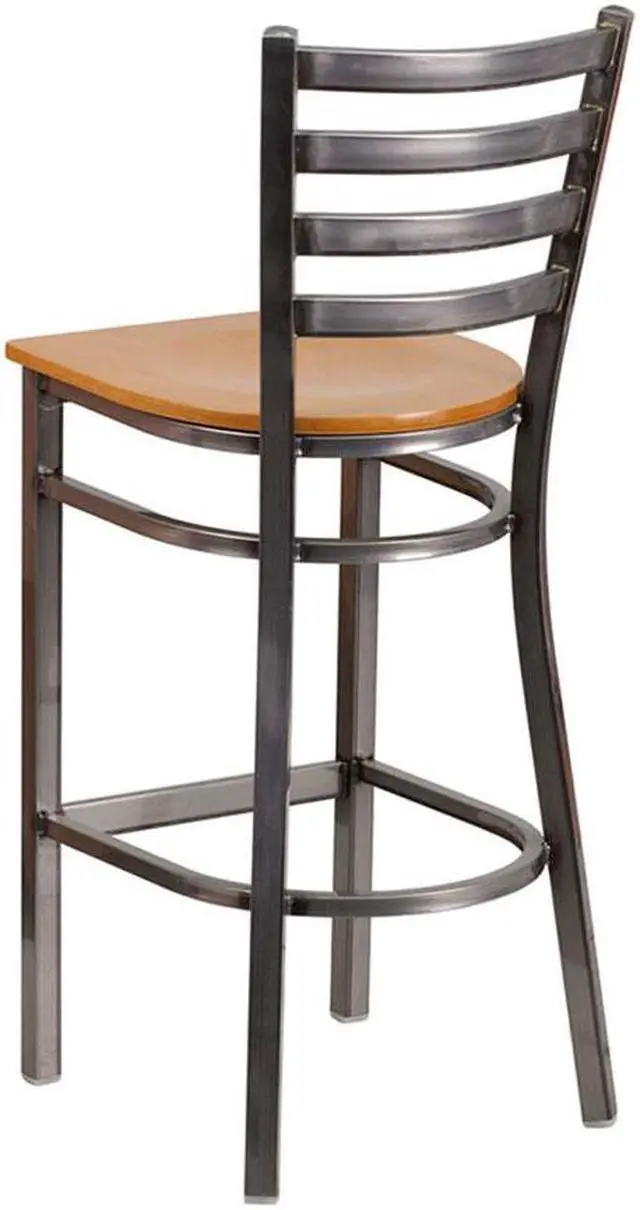Create a first-rate dining experience by offering your patrons great food, service and attractive furnishings. Commercial furniture needs to be both durable and low maintenance so metal barstools are a popular choice for furnishing restaurants, pool halls, lounges, bars and other high traffic establishments. This Clear Coated Ladder Back Metal Restaurant Barstool is easy to clean, which is an important aspect when it comes to a business. Built to withstand the everyday hustle and bustle in the restaurant and hospitality business, these dining stools will also look great in your home. The beautiful wood seat and ladder back design will keep guests comfortable. The frame is stabilized using two welded support bars, which includes a footrest to prevent leg discomfort. The floor glides help protect your floors and ensure smooth gliding. Use this bar height stool in your kitchen, dining room or home bar and give your decor a fresh look. The simple and lightweight design of this stool will not disappoint, whether used in the home or your commercial business.Product Dimension-17"W x 18"D x 42.25"H