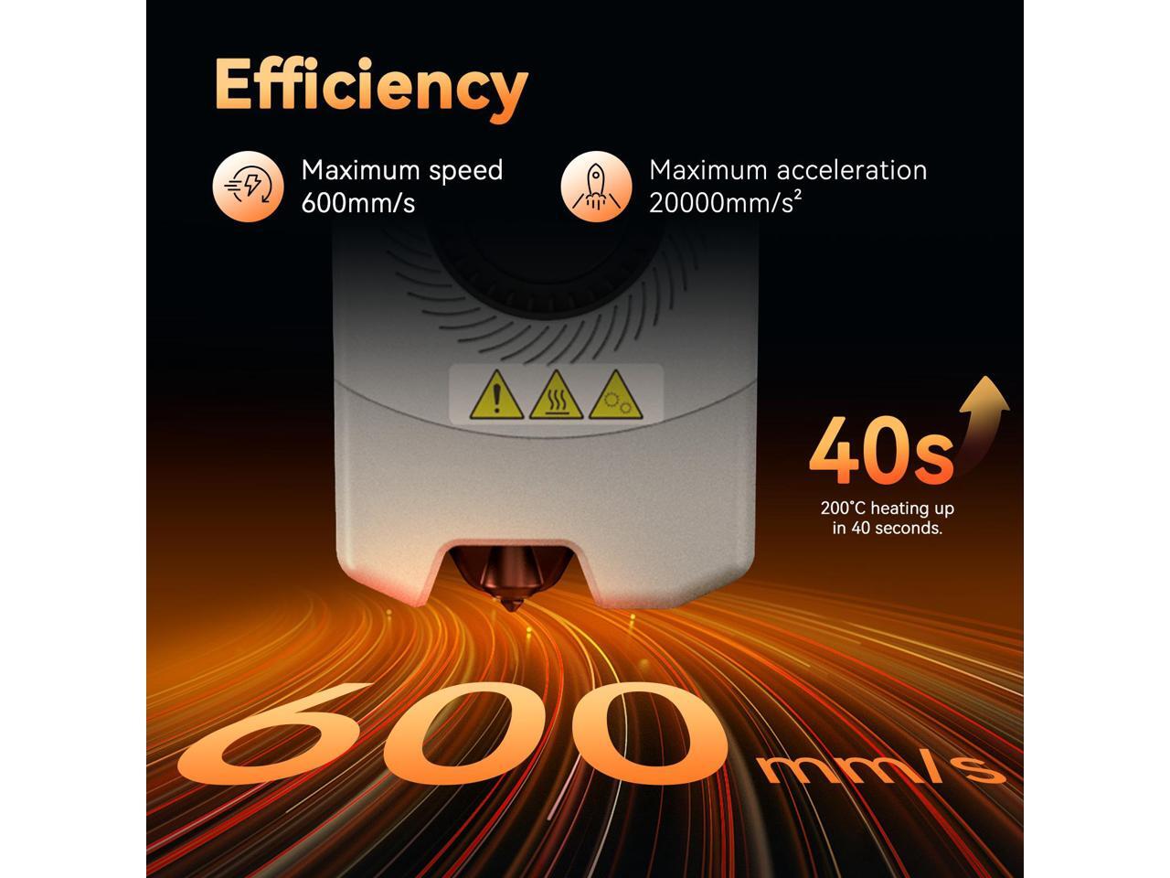 Efficiency. Printing: Maximum speed 600mm/s, Maximum acceleration 20000mm/s². Less waiting time: Nozzle with a flow of 32mm³/s, 50w heating power, 200C heating up in 35 seconds.