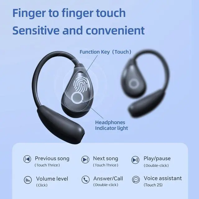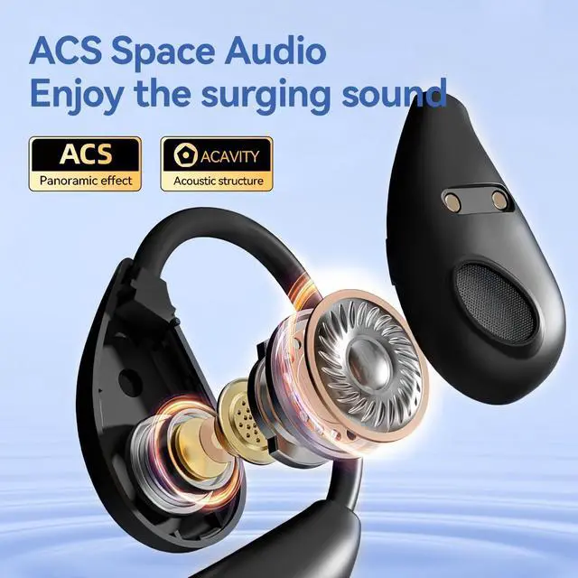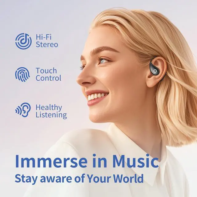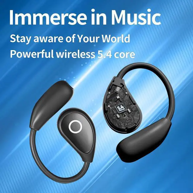 Experience superior sound quality with these innovative open-ear wireless headphones. Featuring advanced Bluetooth 5.4 technology and bone conduction design, these clip-on earbuds deliver crystal-clear audio while keeping you aware of your surroundings. The comfortable, lightweight design makes them perfect for extended wear during workouts, commutes, or daily activities. With ultra-long battery life and convenient LED power display, you'll always know when it's time to recharge. The sleek black finish and compact charging case make these headphones both stylish and portable. Enhanced with ACS surround sound and DirectIn tone technology, these headphones provide immersive audio performance while maintaining a secure, comfortable fit. The wireless design eliminates tangled cords, while the intuitive controls make it easy to manage your music and calls on the go. Perfect for fitness enthusiasts, commuters, or anyone seeking high-fidelity sound without compromising on comfort and convenience.