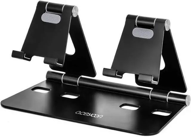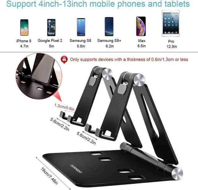?? Wide compatibilityAluminum smartphone stand for desk adjustable could put two phones at the same time. Support 4'-13' mobile phones and tablets widen hook design perfectly match the device with thickness less than 0.6 in/ 1.3 cm thickened phone case can also be used easily. Such as X / 8 / 8 Plus / 7 / 7 Plus / 6S / 6S Plus / 6 / 6S Pad Pro Pad Air Pad mini S3 S4 Note 6 5 compatible for Nexus 5 compatible for XperiaXZ etc.?? Completely foldable designAfter folding only a little bigger than the palm not occupy much space can be easily placed in the bag very convenient to go out and carry the metal tablet stand holder for kitchen foldable?? Super large base strong stabilitySuper large aluminum alloy base strong load-bearing not easy to dump shake do not worry about the safety of devices.