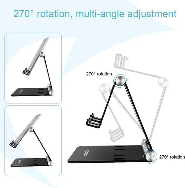 ?? Freely adjust angleThe black phone holder desktop portable supports 270 degrees free adjustment easy to adjust to a comfortable angle to use meet your needs for more scenes.?? Anti-slip silicone padThe base of desk iphone ipad stand for office is equipped with anti-slip mats stability and protect the equipment from scratches.