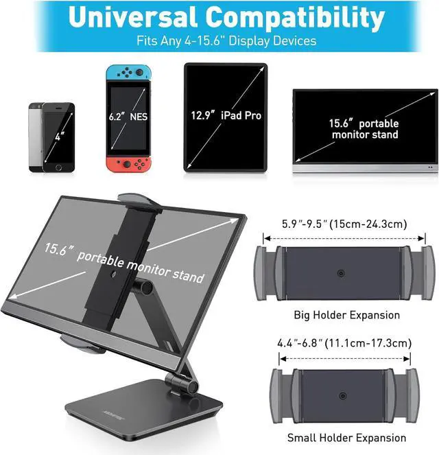 ? Business Oriented - Two size rubber padded brackets collectively fit any 4- 15.6 devices iPad or iPhone or portable monitor an ideal docking station display stand for perfect match of large or small tablet PCs typically used at restaurant shop point of sale office home desktop etc.? Broad Application - AboveTEK portable monitor stand is an ideal reception & kiosk POS solution in retail/hospitality/entertainment/education industries that allows you to type press view swivel with great stability. Confidently interact with customers at restaurant check out at register collaborate in group meeting at office present products or services at showroom and many more.