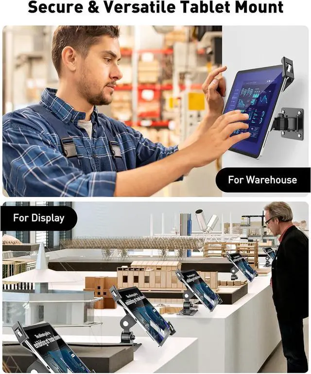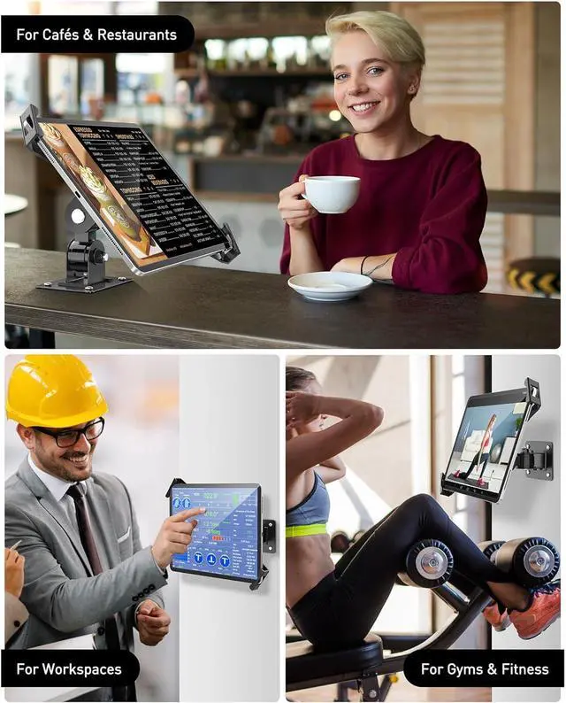 For Homes Stores & Businesses - This tablet wall arm is a versatile way to maintain distance and provide user-friendly interaction for classrooms conference rooms recording studios food delivery restaurant to-go orders healthcare facilities virtual offices gyms and kiosks as well as under kitchen cabinets for recipes and videos. 360° Portrait & Landscape Mode - Adjust and personalize your viewing preference with 360° rotation capability allowing you to choose between portrait and landscape modes. Flexible joint design lets you easily tilt the screen to your desired angle to reduce glare and improve visibility. Great for indoor and outdoor use.