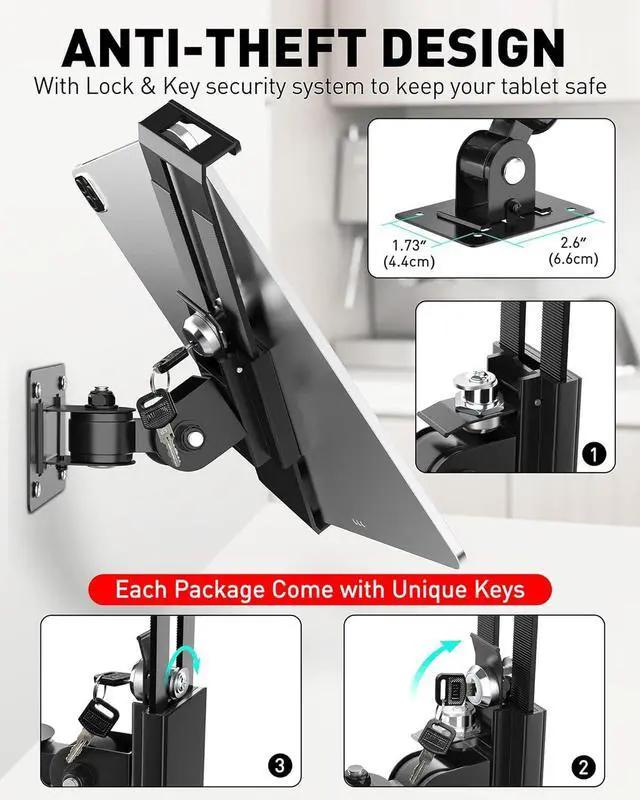 Anti-theft Locking Security System - With the AboveTEK tablet holder wall mount you'll enjoy total safety and peace of mind with our anti-theft lock & key security system. This keeps YOUR tablet protected at all times and unable to be removed from the mount without a key. Ideal for customer-facing businesses and high-traffic points of sale. Easy Mounting and Installation - The AboveTEK wall mount tablet holder is easy to install on any wall and comes with mounting hardware included. Heavy-duty aluminum bracket and metal base ensure durability and wobble-free mounting of your device. 2 rubber pads on the bracket cushion your device while offering secure grip and protection.