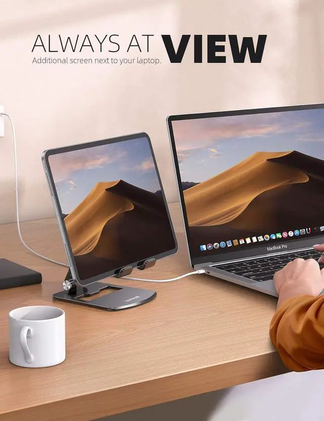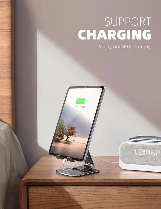New Design As a professional stand manufacturer Lamicall made market research to find the real needs of customers and then developed this fully adjustable tablet stand with superior stability. A perfect iPad desktop stand accessory that frees your hands to watch videos use Facetime view recipes and enjoy games. Light weight & Sturdy Thanks to high-quality aluminum alloy and the larger heavier base Lamicall desktop ipad charging dock stand provides solid support to hold your tablet in the upright position without falling over like others. Foldable Design Dual-hinge adjustment this multi-angle tablet holder can provide more viewing angles you want.