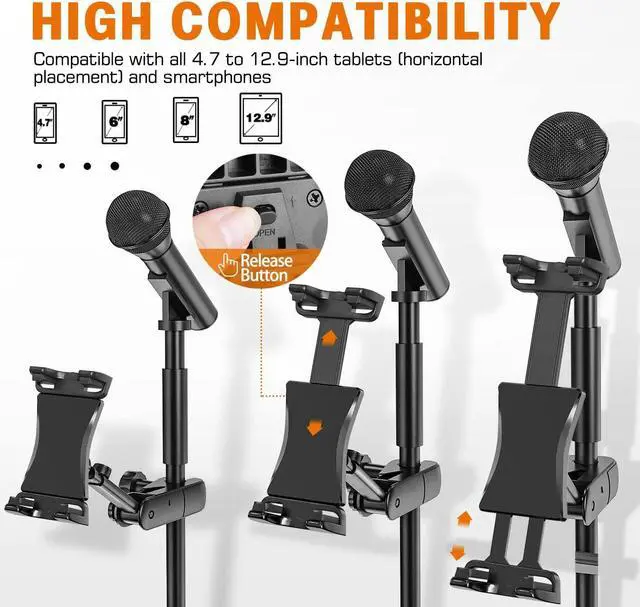 Wide Compatibility - The tablet holder for the mic stand is compatible with all 4.7 to 12.9 -inch screen tablets (horizontal placementand Fit All Smartphones; such as iPad Pro iPad Air Surface Pro iPad mini Galaxy Tab etc and iPhone 13 13 mini 13 pro 13 pro max Galaxy S9 S8 S7 Edge etc. Designed for Mic Stand Tablet Holder - Using a tablet to watch Song Score while performances live is becoming more common. At this time the mic music tablet holder plays its most significant role. It's an excellent way to display song lyrics and chords trigger background tracks or even control live electronic music performances with the tablet.