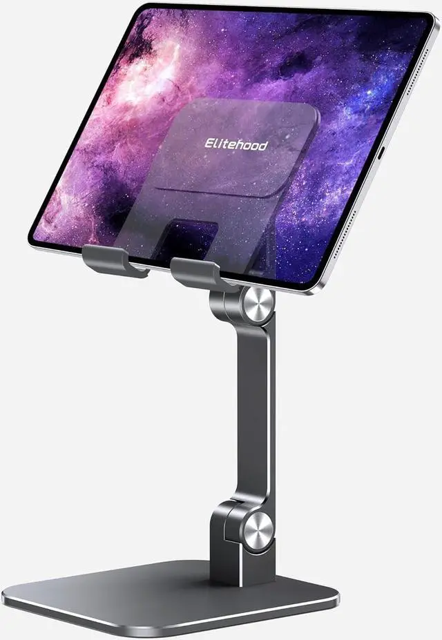 Collapsible & Portable: Elitehood iPad Desk Stand is the perfect blend of quality and portability the matte anodizing aluminum alloy will last through years of continuous wear and tear and is easy to fold up to take on the go! The thick base plate's bottom surface is inset with foam rubber mat and the support/cradle plate has ample rubber protective cushioning to prevent surface scratching of naked devices.