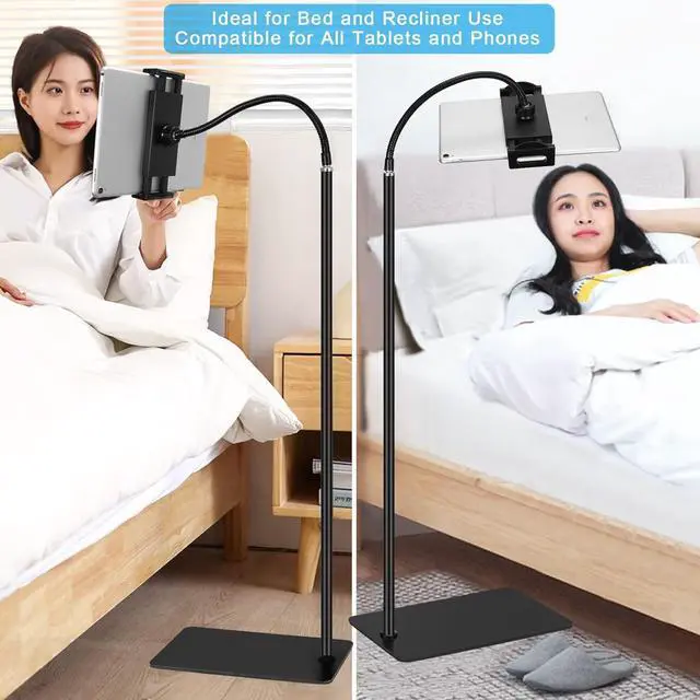 Wide Compatibility: Our tablet floor stand is compatible with all Phones and tablets between 4.7 -13 inches. (Any cases with a width between 4.3 - 9.8 (11cm- 24.8 cm) and thickness within 0.63 ( 1.6 cm) are suitable.