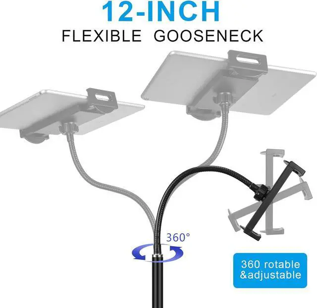 FLEXIBLE TABLET FLOOR STAND: 13.7 -INCH flexible gooseneck arm is long enough. It can be easily adjusted to your desired position. The universal ball on the back of the tablet clamp provides more than 360 degrees rotating. It is available for you to adjust the view angle of tablets or Phones with one hand. Useful - Flexible gooseneck arm can be bent in any directions. 360-degree rotating holder will satisfy your needs better.