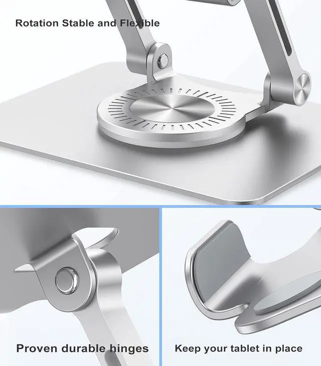 & Convenient: With a 360° rotation base you can freely adjust the angle of the ipad stand holder to set the best viewing angle that suits your preference also making it extremely easy to share content. You can freely adjust the tablet stand angle to a perfect eye level that helps to reduce shoulder and neck pain which ensures you are always in a comfortable position for working or relaxingWidely