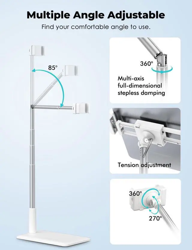 Universal CompatibilityThere are two modes for the clip and the clipping range of the cell phone clip is 2.44 ~ 4.09 (6cm~ 10.4 cm). Press the upper right and lower left buttons gently pull clip on both sides to switch to the tablet holder mode. The clamping range of the tablet clamp is 5.5 ~ 8.4 (14cm~ 21.5 cm). Compatible with 3.5 ~11 inch devices such as iPhone 11 12 13 14 15 16/ Pro/ Pro max/ Mini/ blackberry iPad Air 2 3 4 iPad mini iPad Pro 11 inch Galaxy LG Google Pixel etc. 360° Adjustment&BendableThe mobile phone&tablet clip of the viozon floor stand can be rotated freely 360 degrees and you can adjust the stand to any angle that is most comfortable for you.