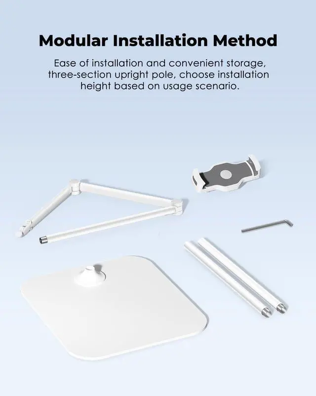 Press the silver magnetic cover at the joint to remove it and use a wrench to adjust the tension for supporting heavier devices. Ensuring that your equipment is stable and will not fall. The stable stand can hold your device in any direction without moving the base. Stable & DurableThe material of the floor stand is aluminum alloy makes the stand more sturdy and reliable. The base mades of solid iron alloy paired with rubber protection pads reduce shakeness while using the stand. Height Adjustable&Save SpaceThe main rods compose by three rods. The whole stand can archieve maximum height of 68/173cm.