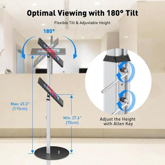Optimal Viewing & Interaction: The floor kiosk iPad stand features a -90°~90° tilt function enhances engagement by reducing glare. Its height can be adjusted from 27.6 to 45.3 catering to various user heights and preferences. Robust Design with