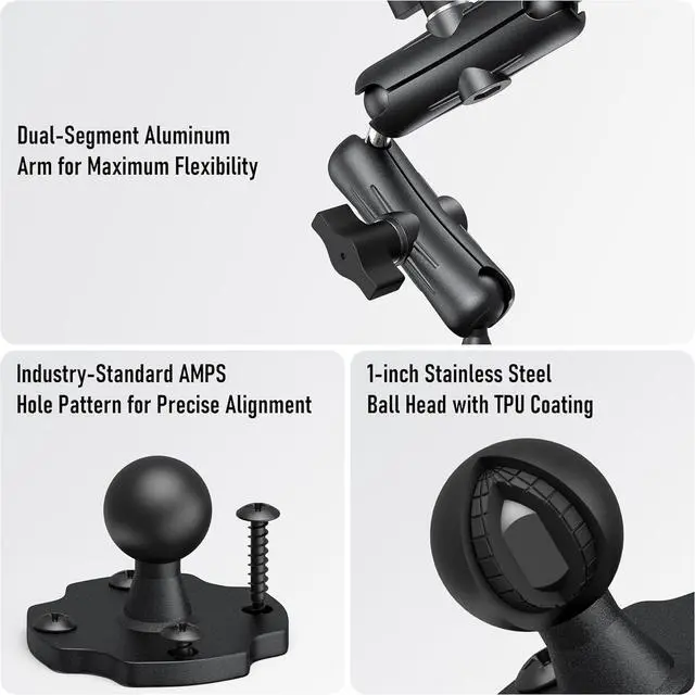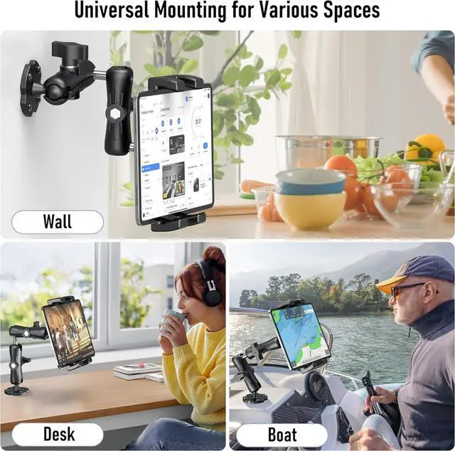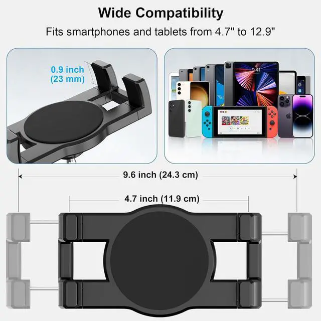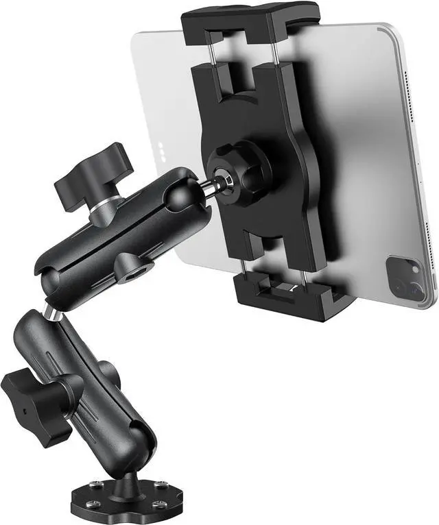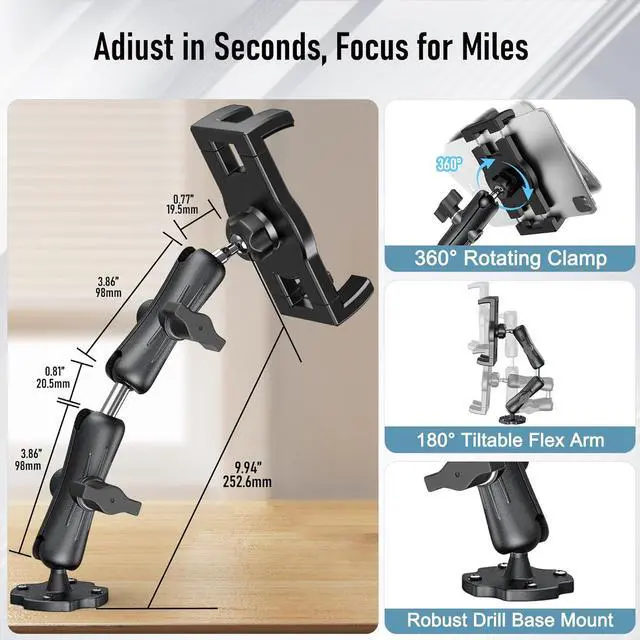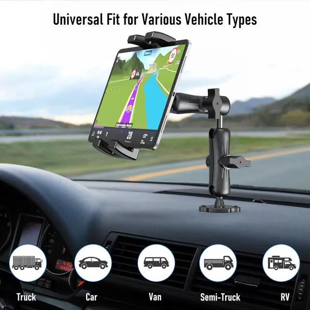 Mount Holder: Our adjustable clamp stretches from 4.7 inches ( 11.9 cm) to 9.6 inches ( 24.3 cm) to fit a wide range of devices from 4.7 to 12.9 in size accommodating tablets up to 0.9 inches (23 mm) thick. This tablet mount for truck is perfect for holding gadgets with or without their cases providing a secure grip for your technology. It's ideal for various models including the iPad iPad Pro 12.9 iPad Mini iPad Air all iPhones up to the latest 15 series Galaxy tablets and Fire HD tablets ensuring you have easy access to your devices. Enhanced Viewing Flexibility & Simple Tuning: With a 360° rotatable base twin swiveling pivots and four movable joints you can seamlessly align your tablet to the optimal position. The dual extending arms tablet car mount can be adjusted from 4.4 inches to 11 inches giving you unmatched adaptability. Easily modify both the height and the angle to achieve a clear unobstructed perspective for navigation communication or leisure activities.