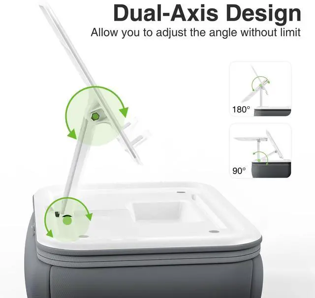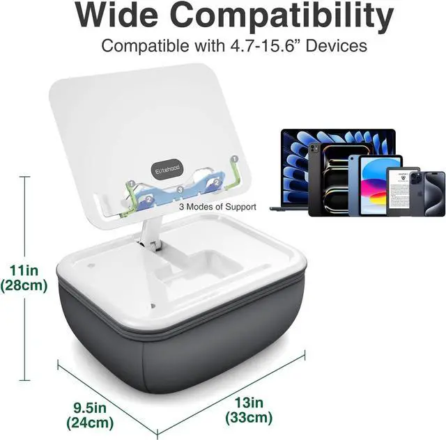Multifunctional Soft Pillow Padelitehood tablet pillow stand for lap provide the best way to hold up your tablet kindle or book while sitting or lying down on the sofa recliner bed chair couch car and etc. iPad pillow stand is built with the most comfortable elastic fabric and soft food-grade EPS foam particles. it can raise your device up to 12 inch for your best viewing and relieve neck strain. dual-axis design allows users to adjust the angle and height without limit. Wide CompatibilityThe soft pillow stand for lap is compatible with all laptops and tablets from 4.7 up to 15.6 including popular models like MacBook MacBook Air MacBook Pro 2024 iPad Pro/Air 13/11 iPad Pro 11/ 12.9 inch iPad Air iPad Mini iPad 8th/ 9th/ 10th generation Kindle Fire HD 7 8 10 E-reader Surface Pro Galaxy Tab S8 S7 A8 A7 Switch magazines books and more! Adjustable Angles & HeightThe design of 2 rotating shafts allows this bed iPad holder to be adjusted in multiple dimensions including any angle and appropriate height support both horizontal and vertical viewing.