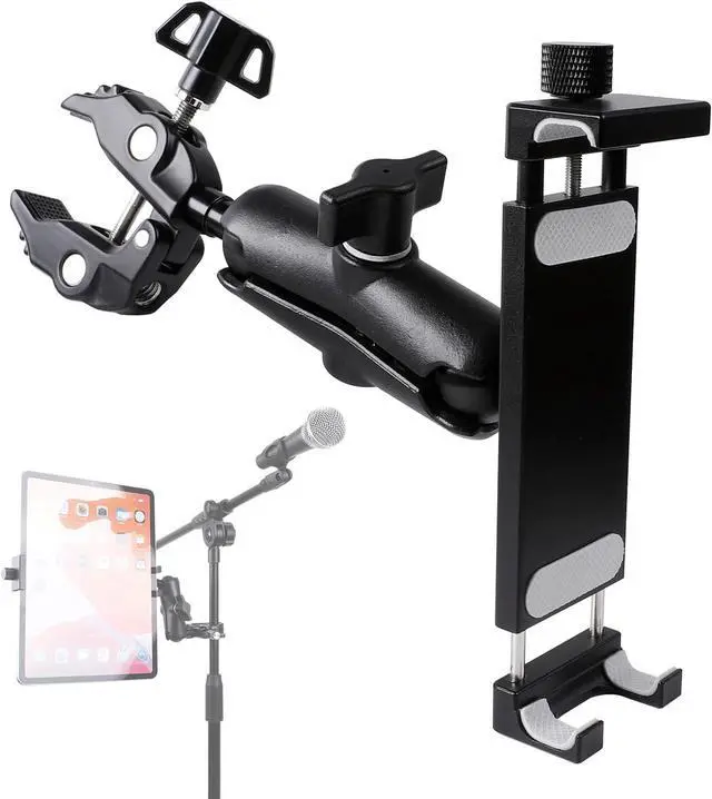 Super Clamp Feature: The aluminum alloy super clamp boasts a wide application range with a max opening of 2.48 inches at the base. It can securely attach to mic stands boom arms music stands and can also be used for dynamic bicycles treadmills elliptical machines baby strollers shopping carts stationary bicycles or other fitness equipment with handlebars.