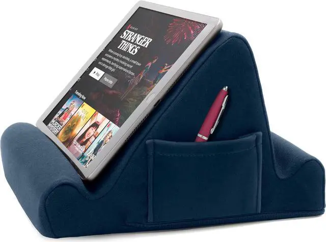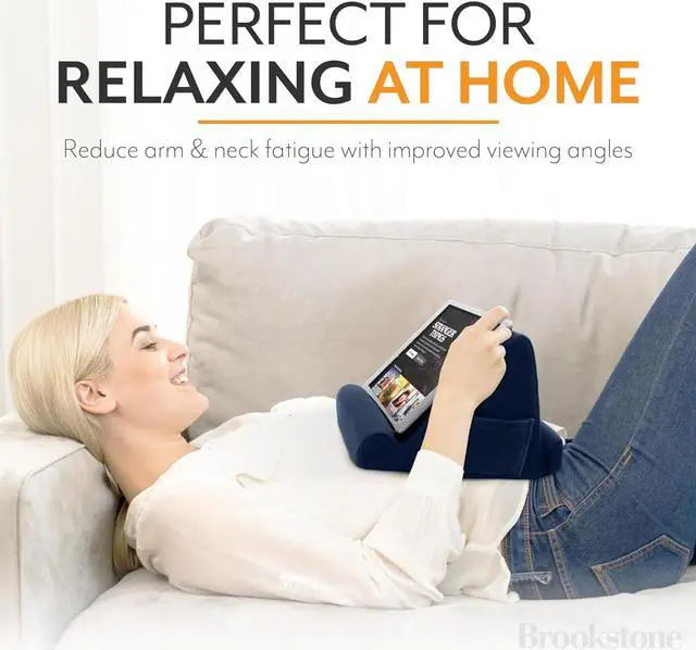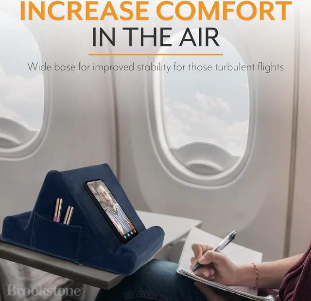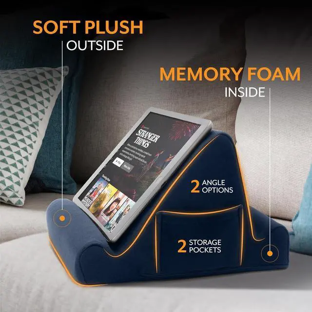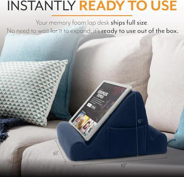 TABLET / E-BOOK READER MEMORY FOAM LAPDESK whether you travel for work or pleasure use our tablet cushion stand for your device and enjoy the comfort and practicability the triangular design offers. Whether youre using it on your lap or on a table the 2 different display angles mean you can work from anywhere. UNIVERSAL DESIGN our tablet stand offers a solution to travellers who wish to work watch videos participate in webinars and conduct virtual meetings thanks to the fact it can support a range of tablets and devices. Whether its an iPad Kindle phone or convertible laptop it can reston our travel tablet cushion in one of 2 angled positions for optimum comfort and viewability.