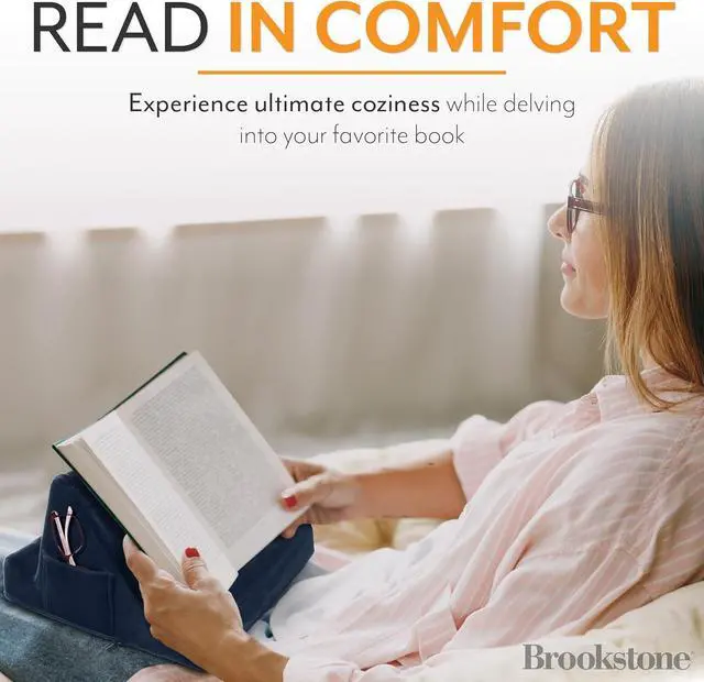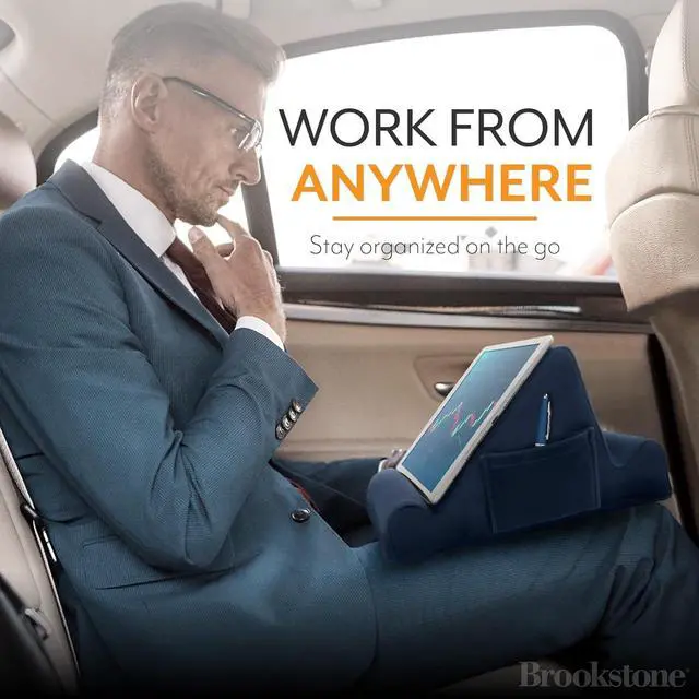 Our plush tablet holder can sit comfortably on your lap or any flat horizontal surface. Your device will remain in place so you can watch read or type without the interference of doing it on the move. NOT JUST FOR WORK if you love to travel whilst watching a movie or perhaps you like to video call friends or family whilst on the move then our tablet device holder is exactly what you need. Regardless of what youre using your device for our Brookstone tablet cushion will hold your device comfortably whilst you pass the time reading viewing or even playing a game! It is the must have travel accessory to ensure long journeys dont drag.