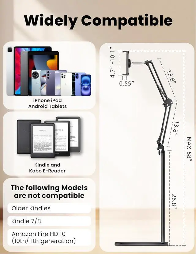 58. Whether lying down sitting or standing the flexible arm easily adjusts to your ideal position on a bed sofa or recliner. The dual-support arm structure ensures increased reliability. Wireless Kindle