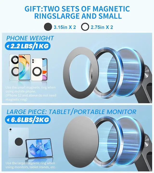 Applicability: 6.5 -inch- 18.5 -inch portable display (please confirm that your device weighs less than 6.6 pounds and there is a flat area in the middle of the back that can be adsorbed) compatible with iPhone (12-16 series) Perfect fit for almost all tablets/iPads (without protective case use the included metal ring). For devices that cannot be directly magnetically adsorbed use the metal ring to ensure secure adsorption.