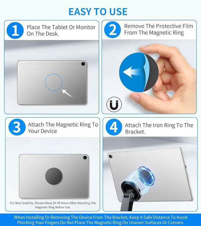 How to Use: This tablet stand is used in conjunction with the included metal ring to firmly fix your device. Just bring the tablet/small display close to it and it will lock into place immediately. Some tablet metal back devices can be directly adsorbed please confirm before adsorbing.