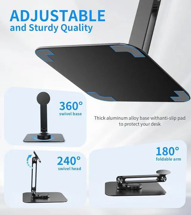 Swivel Base: The thickened aluminum alloy base supports 360° rotation and the folding arm can be folded 180° providing unparalleled adjustment functions convenient for typing or displaying and will not miss any viewing angle which is perfect for video calls work or study. And because of the strong magnetism the fixation is super strong and monitors/tablets smaller than 17 inches can be placed in portrait or landscape orientation.