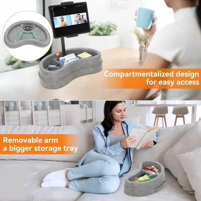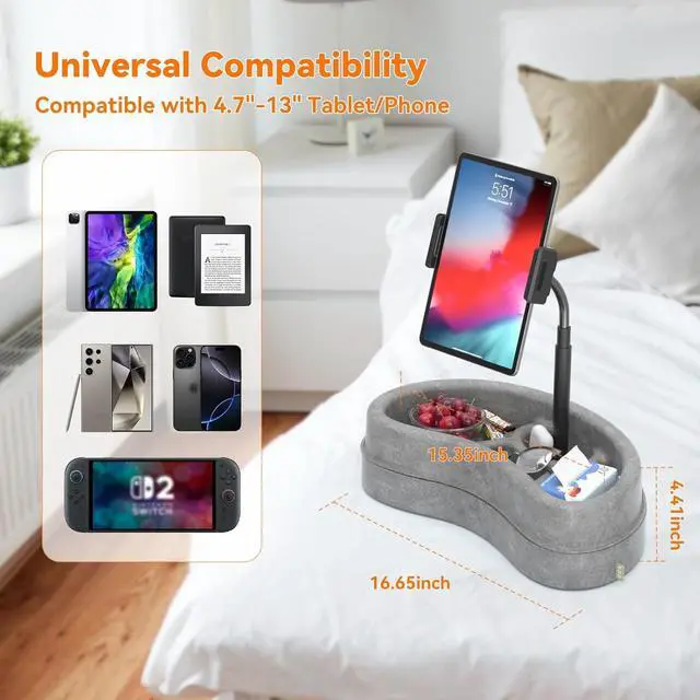 The clamp on this iPad pillow stand is equipped with non-slip rubber pads which will hold it firmly in place protect your device and ensure stability. Large-capacity Divided TrayThe tablet stand pillow tray features three separate compartments offering ample space to neatly store snacks phones keys and other small items. Say goodbye to clutter and keep your essentials organized. By removing the gooseneck bar you will get a separate tray with more storage space which is very practical. Ergonomic and Skin-Friendly DesignThe iPad pillow stand for lap adopts an ergonomic crescent-shaped pad design that fits snugly against the waist and abdomen reducing discomfort caused by prolonged use.