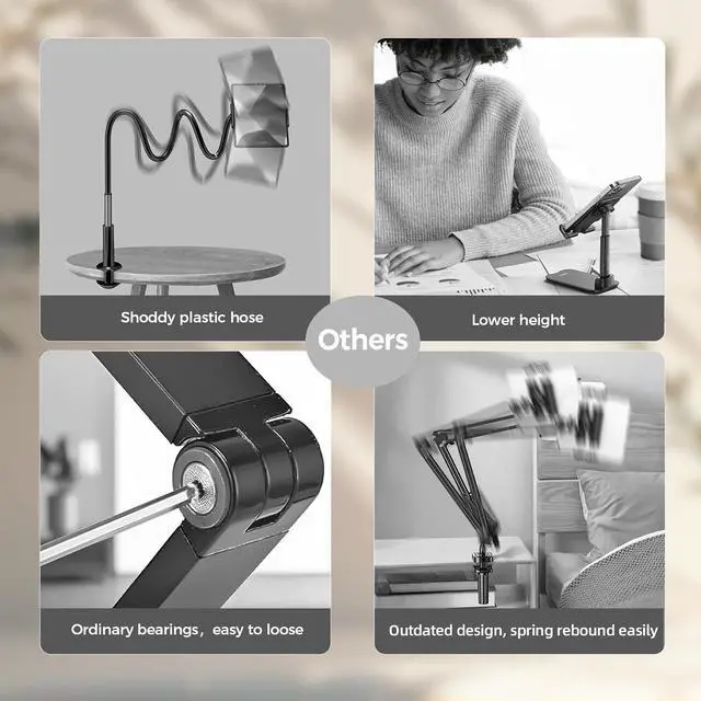 Heavy-Duty Stability Unlike wobbly gooseneck stands our tablet stand features reinforced aluminum alloy joints and ungraded damping design which provide stable support for your most large devices/portable monitors with a maximum load capacity of up to 3.3 lbs/ 1.5 kg (such as iPad Pro). The C-clamp boasts soft silicone pads to prevent scratches and slipping during use. Universal CompatibilityThis tablet holder comes with a retractable clip that perfectly fits 4.7 - 15.6 devices including iPad Pro 11/13 inch iPad Air 11/13 inch iPad 10/9th Gen iPad Air 4/5 iPad mini 5/6 Galaxy Tab S9/S9+ Plus/S9 FE/S9 FE+/S9/S8/S8+/S8 Ultra/A9+/A8/S7/S6/S6 Lite series Kindle Fire HD 10/8 Surface Pro 9/8/7.