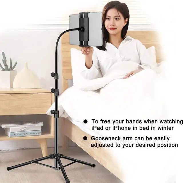 Upgraded Tripod Base: Our tablet tripod stand base is upgraded to longer legs Heavy duty base makes the stand more stable and never tipping over. Made by premium aluminum alloy the gooseneck arm and extension tube are more durable than others. Awlbstruse ipad tripod stand provides safe and secure support for your device. Versatile Gooseneck iPad Tripod StandThis ergonomic gooseneck tablet holder suits most tablets and phones. you can easily get your desired angle to meet your needs at different angles and positions. Except for watching movies you are also allowed to use your iPad for visual presentations like reading sheet music watching videos zoom calls online teaching public speaking reading e-books giving performances etc. Height adjustable and 360 degree rotation - Equipped with height adjustment function from 27 to 65 inch makes this iPad floor stand easy to suit all of your viewing postures such as lying sitting standing and so on. The tablet holder can be rotated 360 degree making it easy to switch your tablet from portrait mode to landscape mode. Wide CompatibilityIt works with various tablets and mobile devices ranging from 4.5 to 12.9 inch-screen including iPad mini iPad iPad Air iPad Pro 12.9 '' and many other tablets.