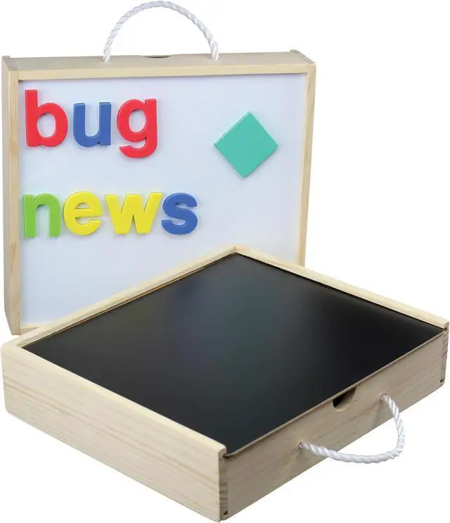 Activity fun box features a versatile surface to provide children with a fun way to use magnetic letters and shapes, dry-erase markers and chalk. Convenient storage space keeps all of your supplies readily available. Rope handle allows easy transportation for both children and adults. Thumb-cut opening allows you to quickly flip the surface or access your supplies.