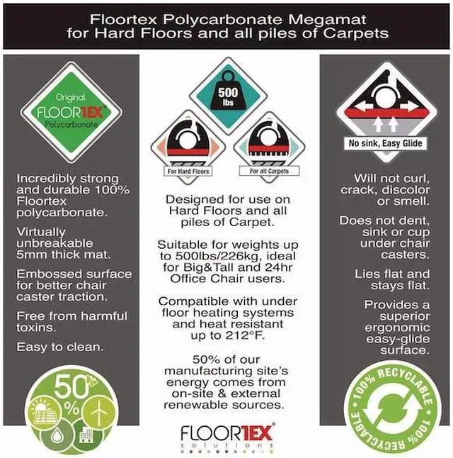 Provides ergonomic benefits for chair users by providing easy glide movement and reduced leg fatigue. Free of toxic chemicals and PVC. The incredibly tough Polycarbonate plastic used to make this mat has been tested for loads up to 500 pounds. It has an easy-glide surface, designed for its ergonomic benefits to the user. Suitable for all carpeted, hardwood, vinyl, wood, tiled and laminate flooring.