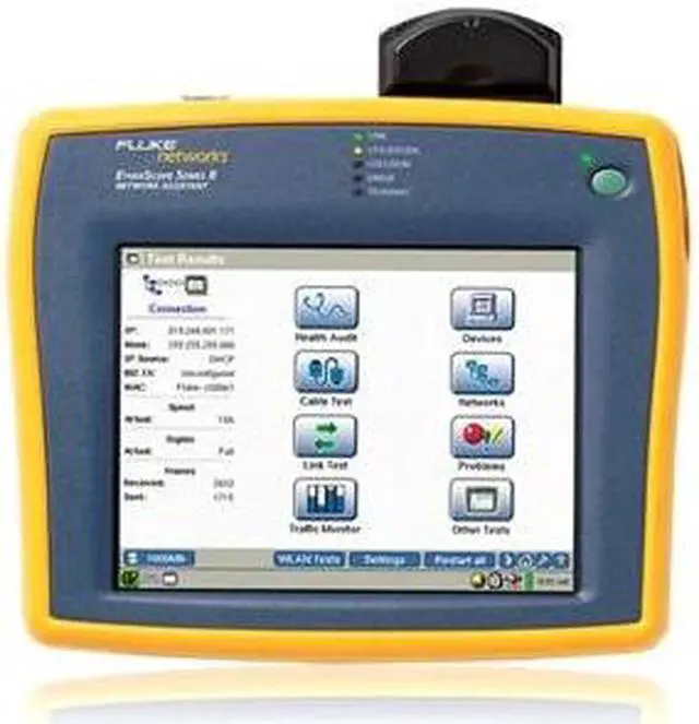 The handheld EtherScope analyzer assists network professionals with installation, validation and troubleshooting of Gigabit LANs and 802.11 wireless LANs. Install and integrate infrastructure easily by testing, verifying and fixing configuration issues during deployment. Validate network performance and service delivery by measuring key performance attributes and the availability and responsiveness of essential resources.